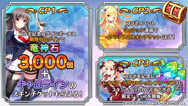 『レッドコラプション』とのコラボを記念したログインボーナスを開催中!期間中にログインするだけで、ガチャやスタミナ回復に使用できる「竜神石」を最大3,000個プレゼント!さらに「キャロライン」のコラボ限定スキンチケットも獲得できます。
