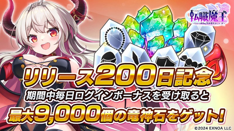 転職魔王はもうすぐリリース200日を迎えます。これを記念して、キャラクター「リタ」や「竜神石」、さらに装備強化アイテムが大量に手に入るログインボーナスを実施中!