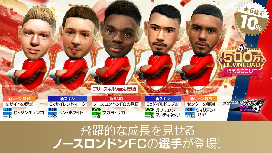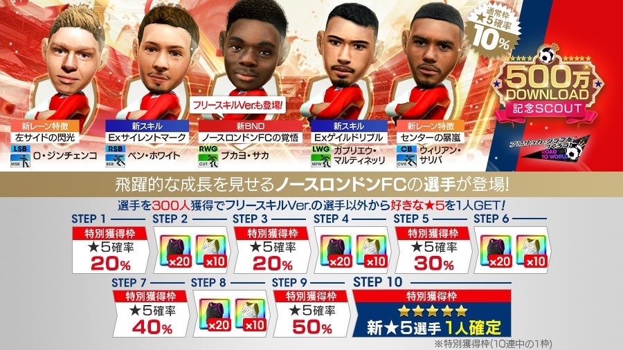 『プロサッカークラブをつくろう! ロード・トゥ・ワールド』イングランド強豪クラブの現役選手が登場する“500万DOWNLOAD記念SCOUT”開催!“500万DOWNLOAD記念キャンペーン”も!