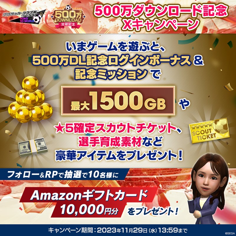 「サカつくRTW」の500万ダウンロード突破を記念して、「サカつくRTW」公式アカウントをフォローのうえ、対象投稿をリポストした方の中から抽選で10名様に、Amazonギフトカード10,000円分が当たります。奮ってご応募ください!