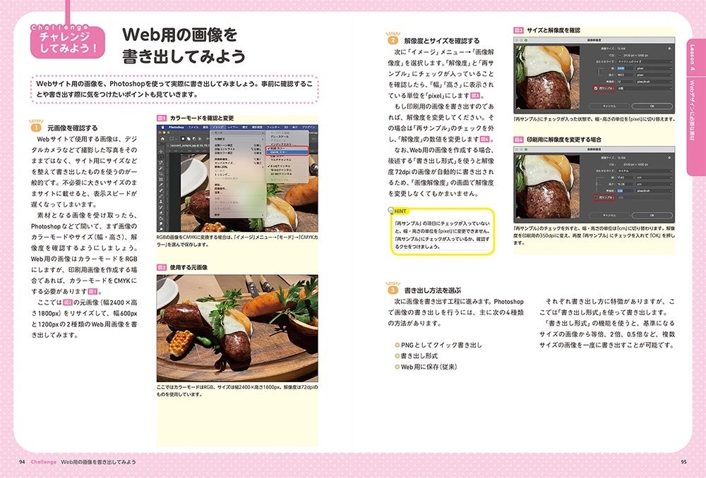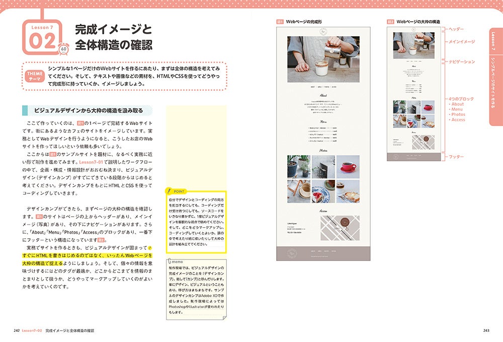 実践パートで学習用サンプルとして制作するのは、シングルページのシンプルなお店のサイトと、レスポンシブWebデザインを取り入れたサイトの2つです。手順に沿ってやってみるチャレンジパートもあるほか、学習用サンプルはダウンロードデータとして提供。