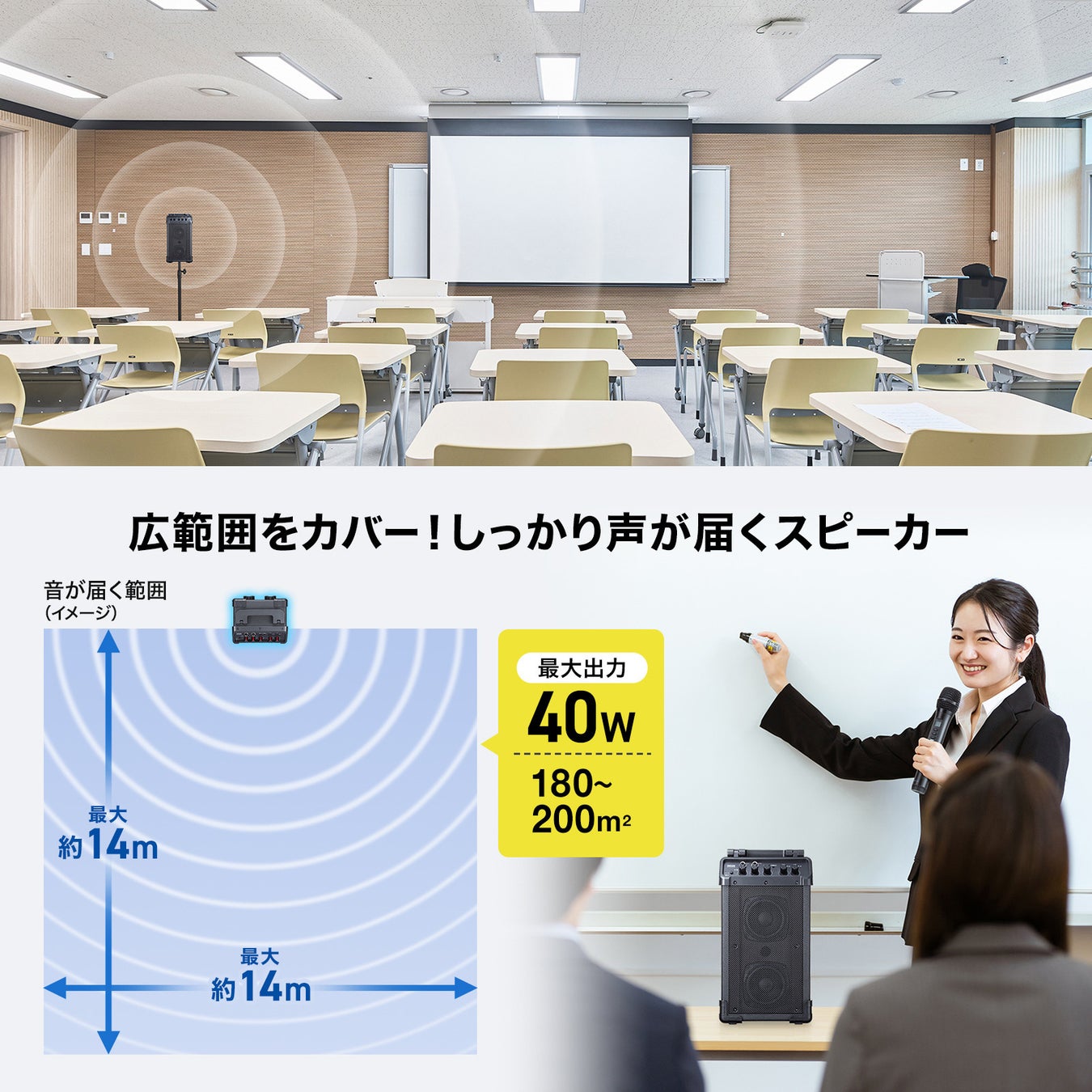最大40Wの高出力スピーカーで、屋内約180~200平方メートルの広い場所でも声をクリアに届けることが可能です。