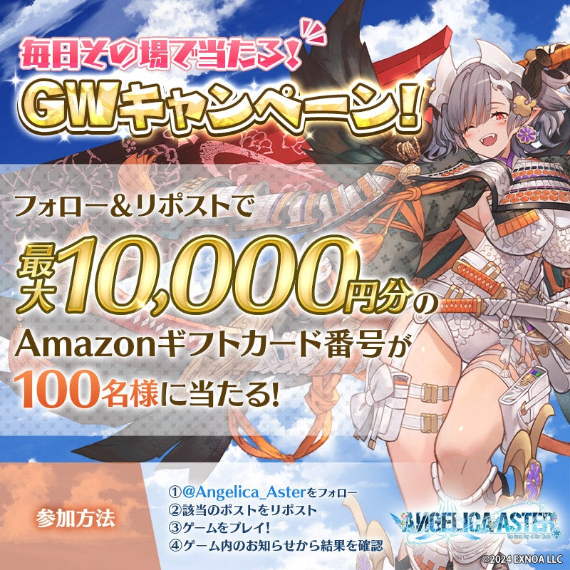 DMM GAMES『ANGELICA ASTER』強化アイテムがもらえる特別ログインボーナスや最大1万円分のAmazonギフトカード番号が当たる GW特別キャンペーン開催!