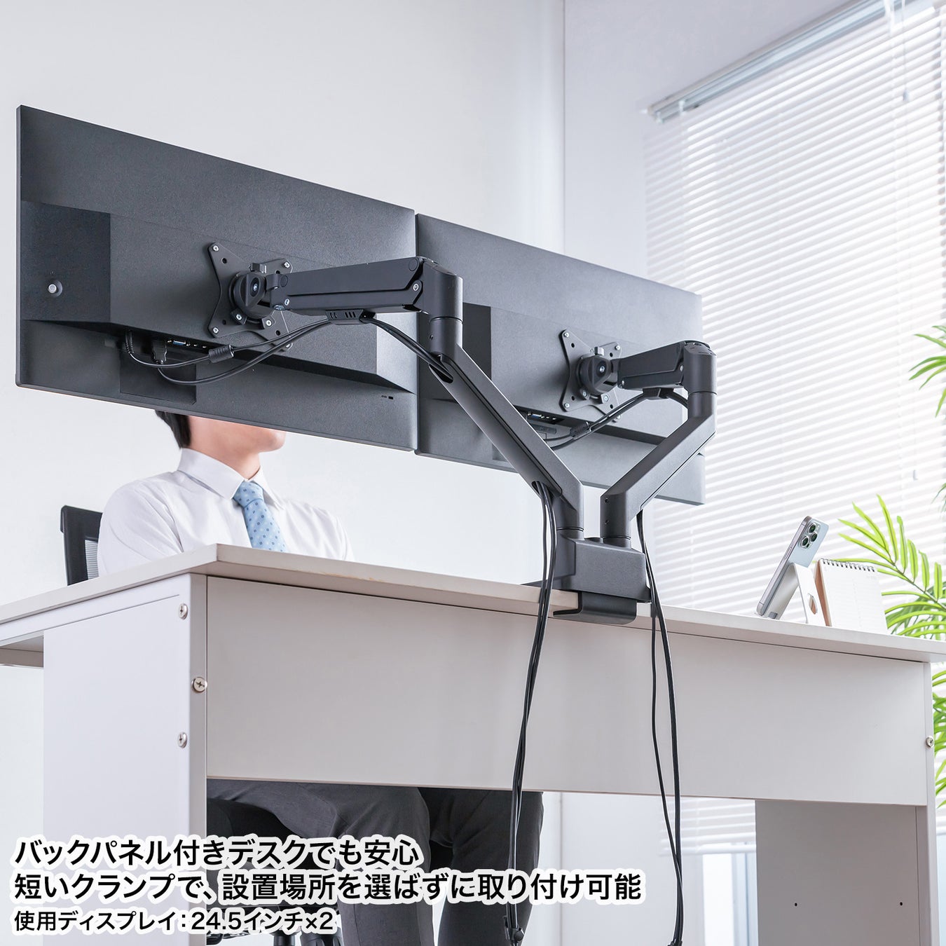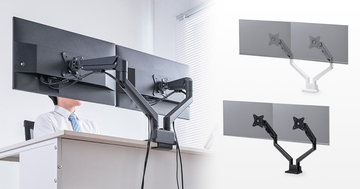 薄型ショートクランプで机のバックパネルに干渉しない、ガススプリング式デュアルモニターアームを発売