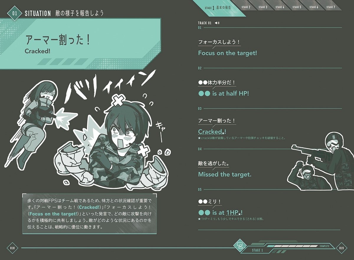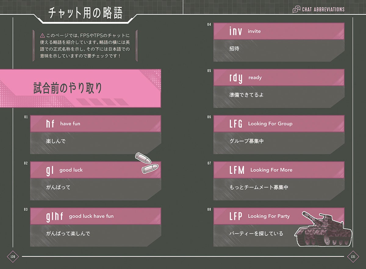 本書は、「割った!」「ラグい」などのあるあるフレーズから「決め撃ち」「角待ち」などの用語、そして「gg」などのチャットで使える略語までカバーされている、史上初のFPS専用フレーズ集です。