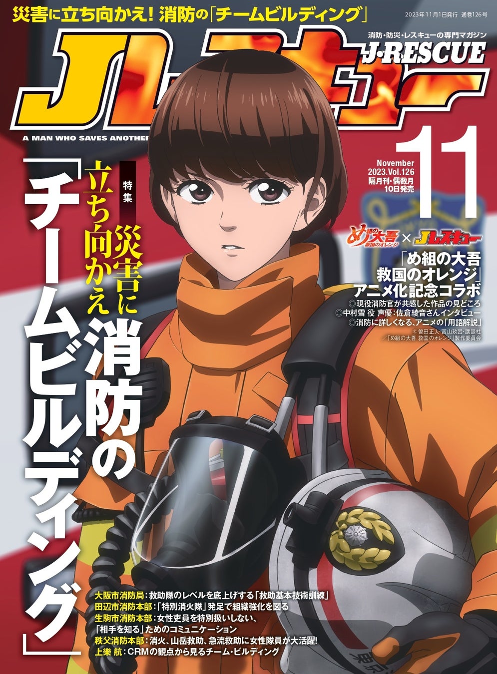 Jレスキュー2023年11月号は、アニメ『め組の大吾 救国のオレンジ』とコラボし、Jレスキュー初の描きおろしビジュアルの表紙となることに加え、作品に関連した特集記事を掲載します。