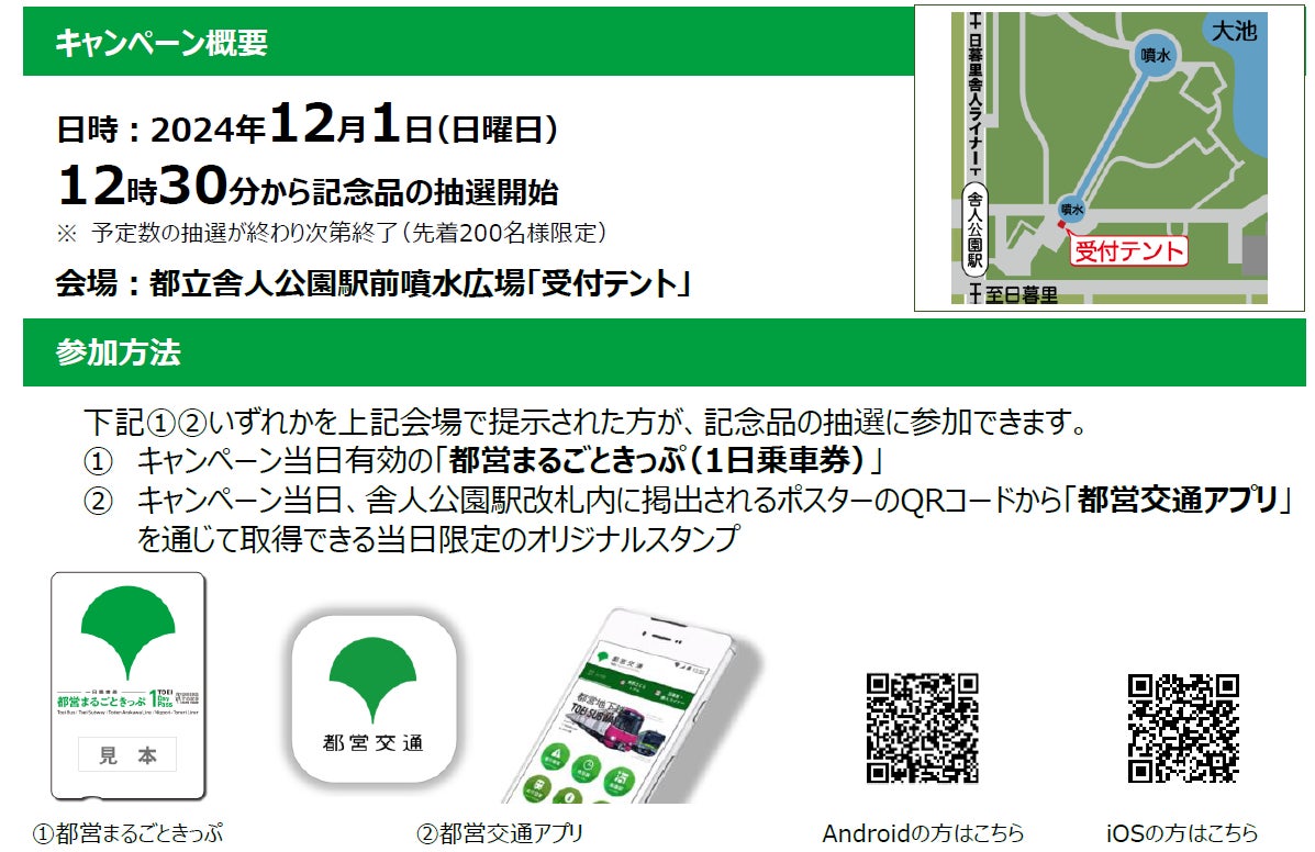 「舎人公園駅改札内にて都営交通アプリで取得した当日限定のデジタルスタンプ」を提示された方に、数量限定で記念品をプレゼントいたします。