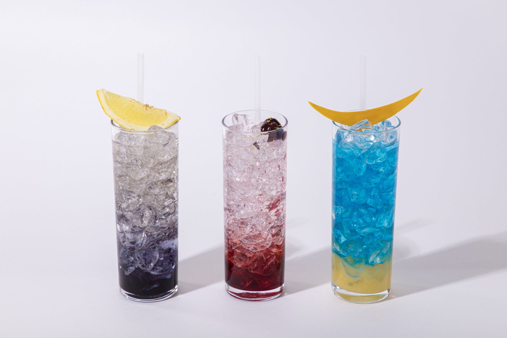 左から、レオン・S・ケネディ、ダンテ、伊達政宗の3人をイメージしたドリンク。色合いもきれいで爽やかな飲み口のドリンク!