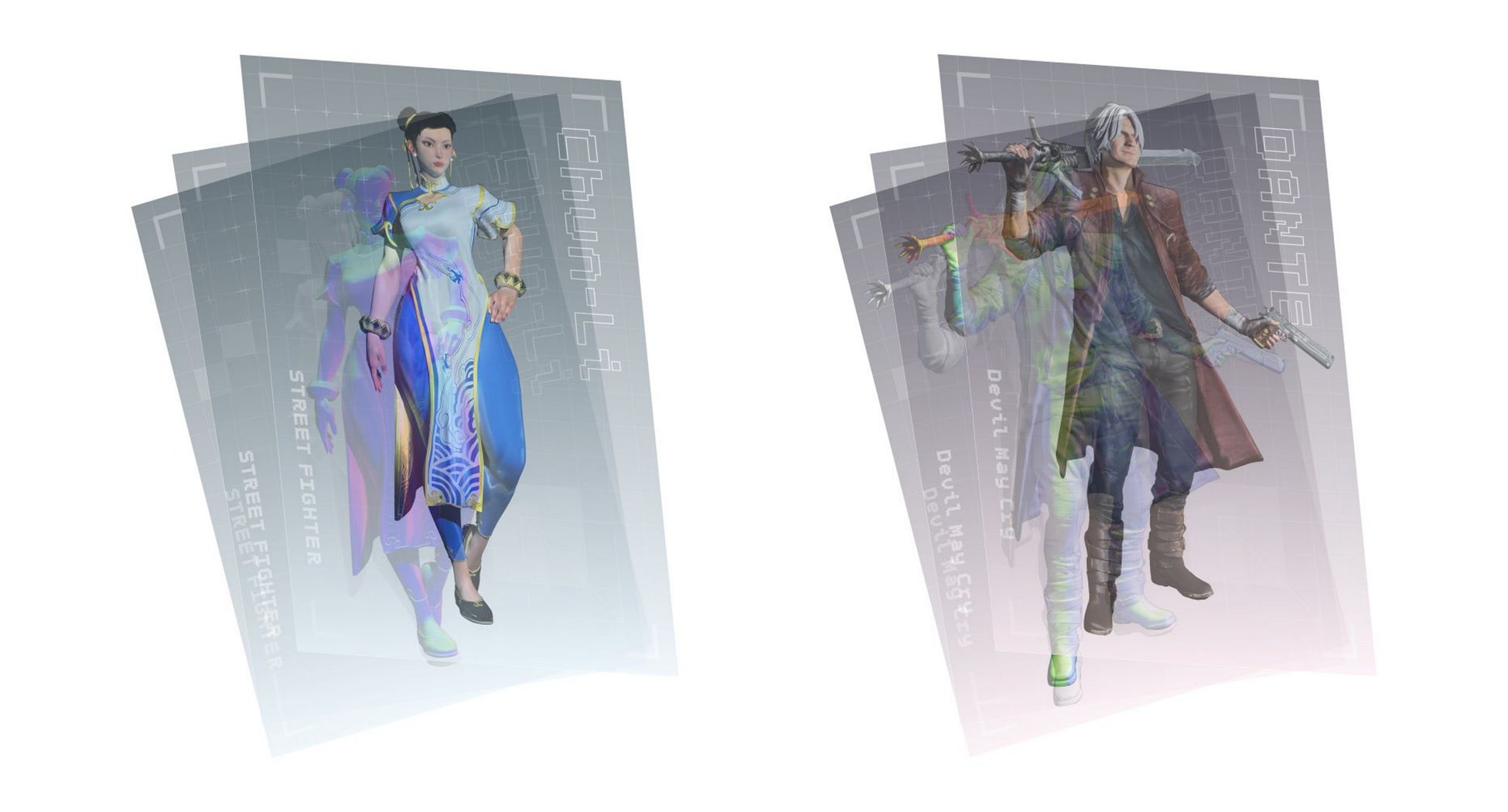 「プロジェクションマッピング(春麗/ダンテ)」の展示を、角度を変えると画像が3パターンに切り変わるレンチキュラーのポストカードで再現。春麗とダンテの2種。