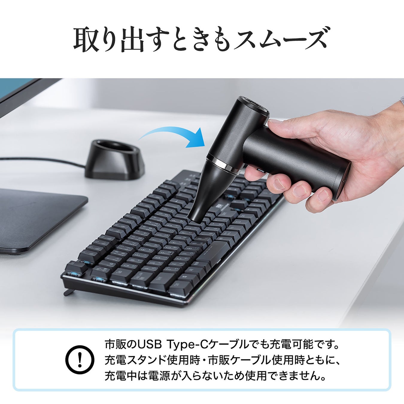 専用の充電スタンドが付属しています。使用後は充電スタンドに置くだけで簡単に充電をすることが出来ます。また、スタンドになっているため、保管場所に困ることがありません。充電忘れによる使用不可を防ぎつつ、省スペースで収納することが出来ます。また、市販のType-Cケーブルでも充電することが出来ます。※充電中は使用できません。
