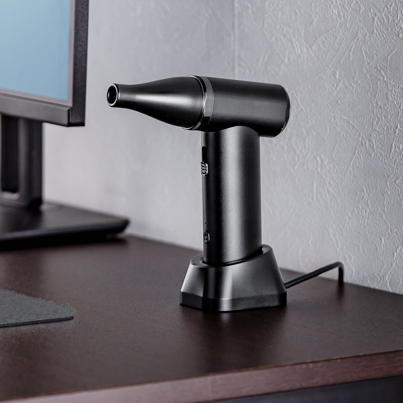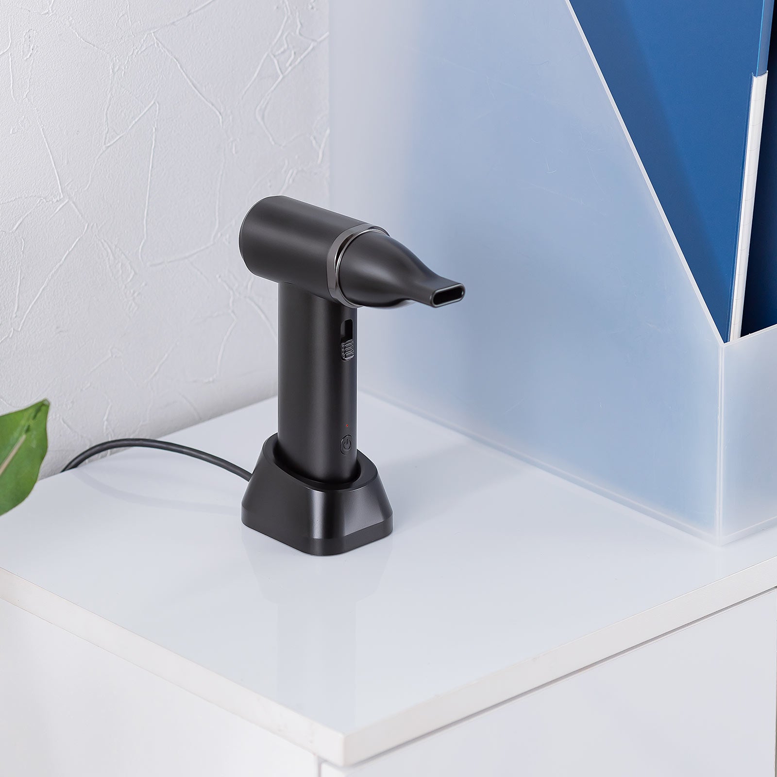 専用の充電スタンド付きで、置くだけで充電ができいつでも気軽に使用できる最大風速27m/sの電動エアダスター