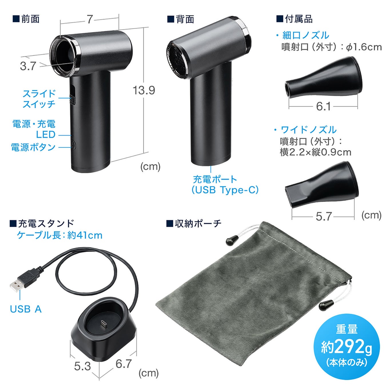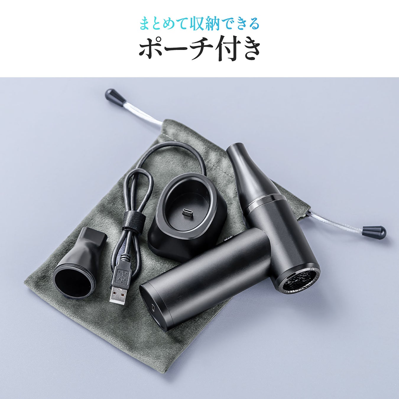 用途に応じて使い分けができる2種類のアタッチメントに、電動エアダスターやノズル、充電スタンドをまとめて収納できるポーチが付属しています。