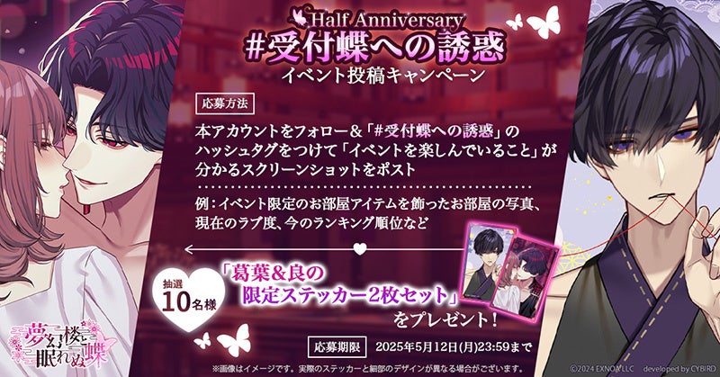 DMM GAMESを運営する合同会社EXNOA(本社:東京都港区、CEO:村中 悠介、URL:https://games.dmm.com/)は、オトナの女性向け恋愛ゲーム「夢幻楼と眠れぬ蝶」にて、新たなゲーム内イベントとガチャの開催をお知らせいたします。また、限定ステッカー2枚セットを抽選で10名様にプレゼントするゲーム内イベント連動キャンペーンの開催もお知らせいたします。
