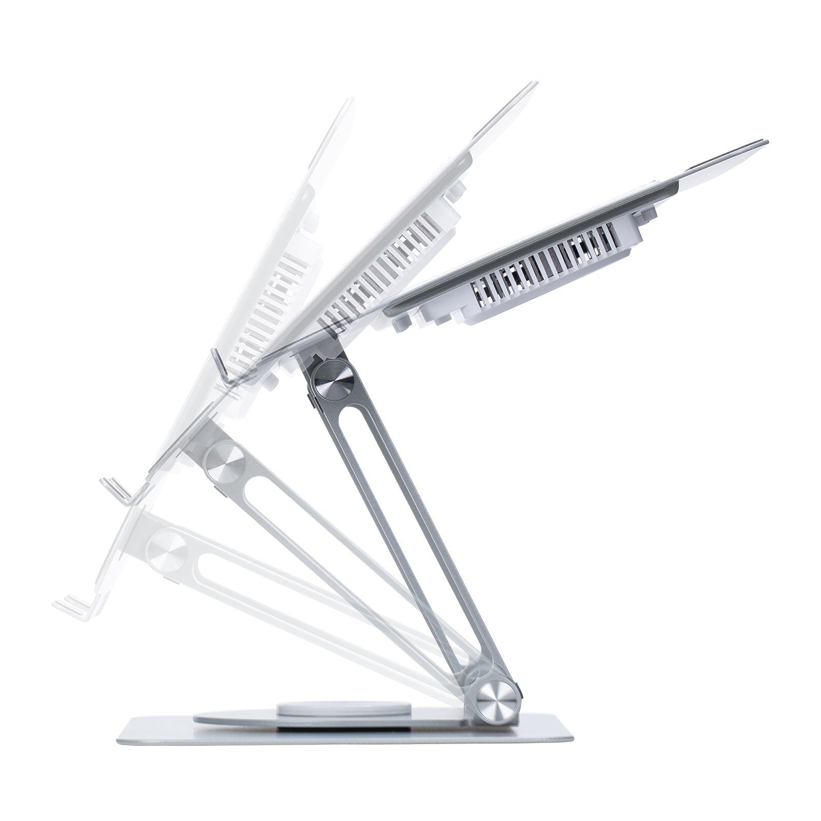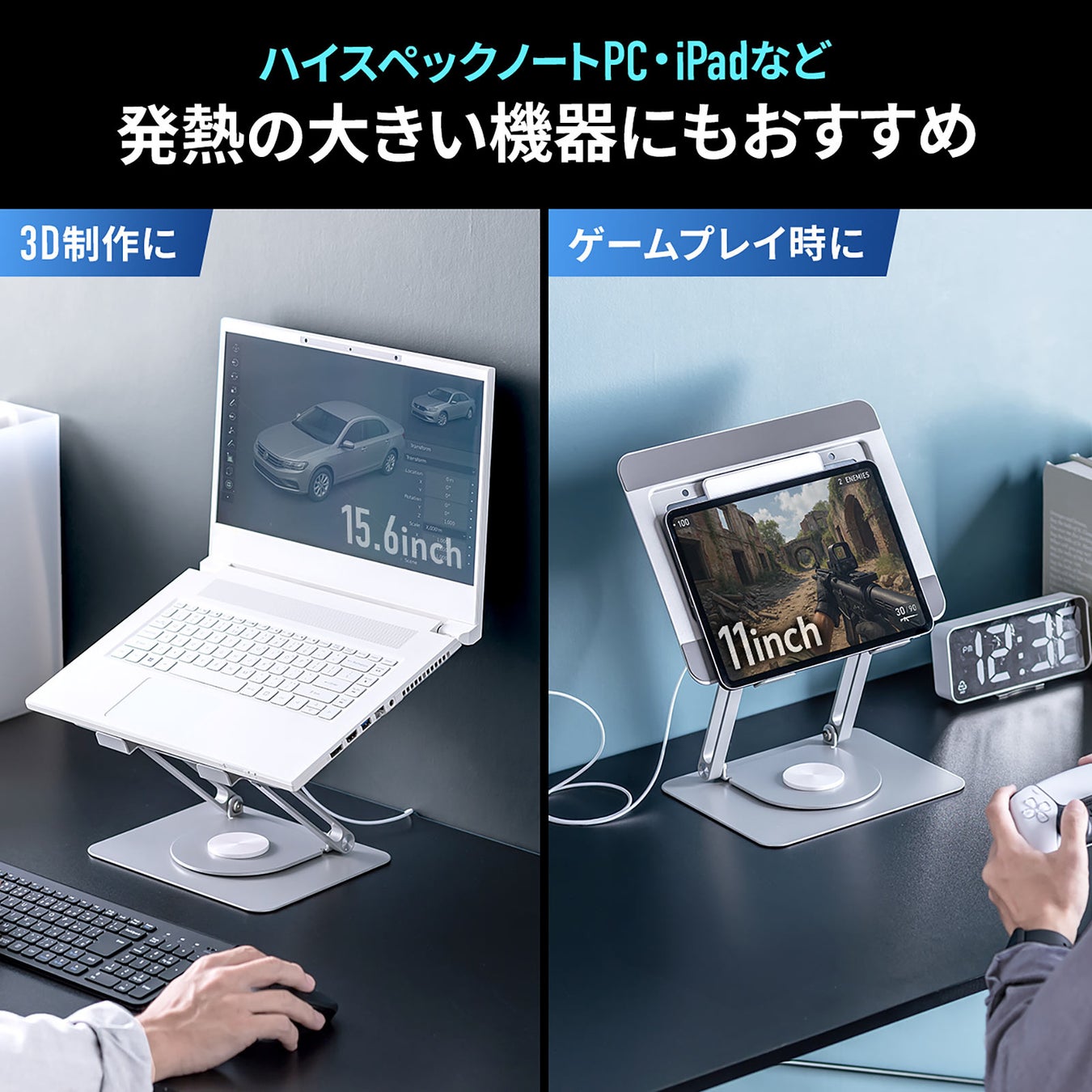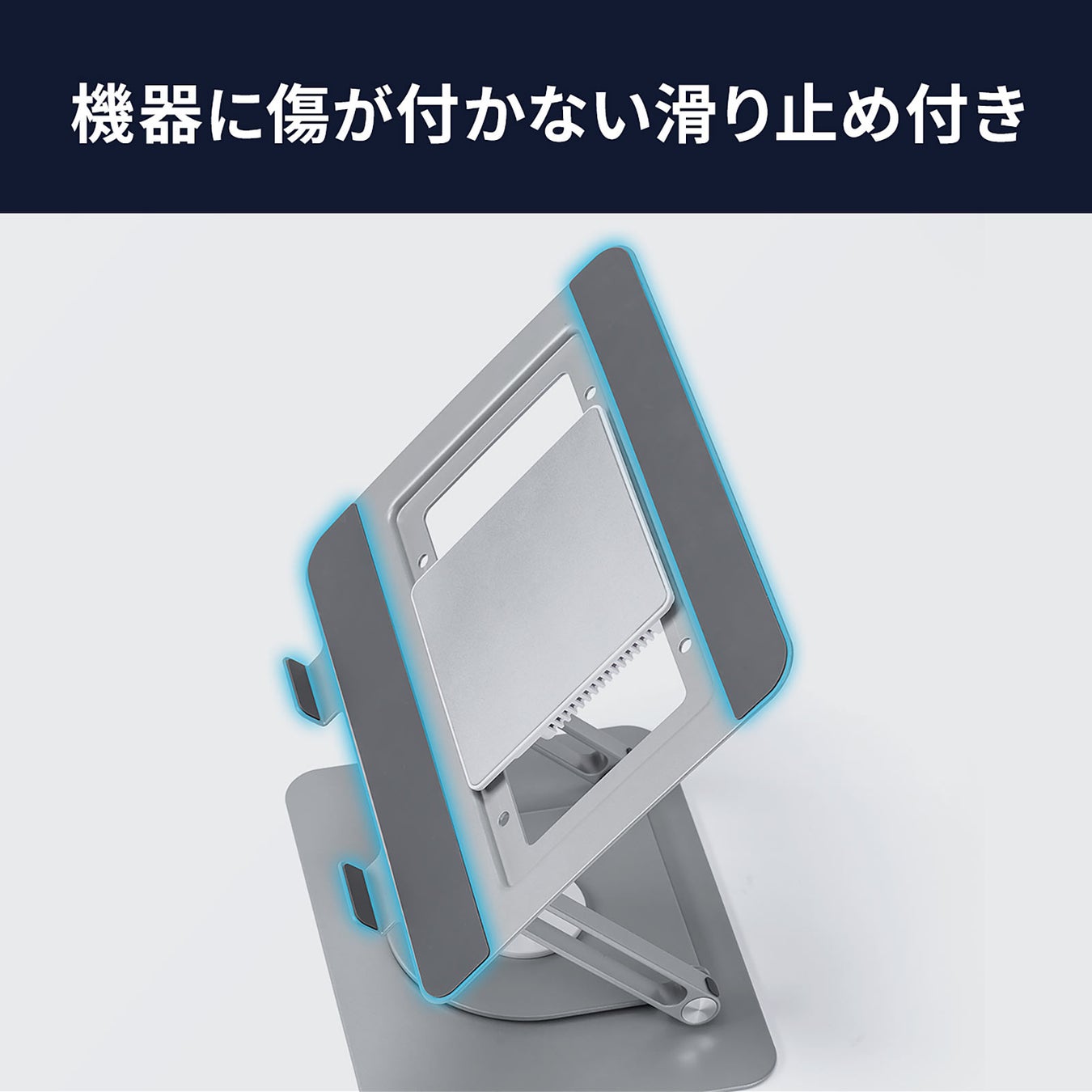 最大17.3インチまでのノートPCやタブレットに対応。重さ約2.3kgの安定感ある構造で、大型端末もぐらつかずにしっかり支えます。滑り止めストッパーも装備し、機器の落下を防止。見た目以上にタフなスタンドです。