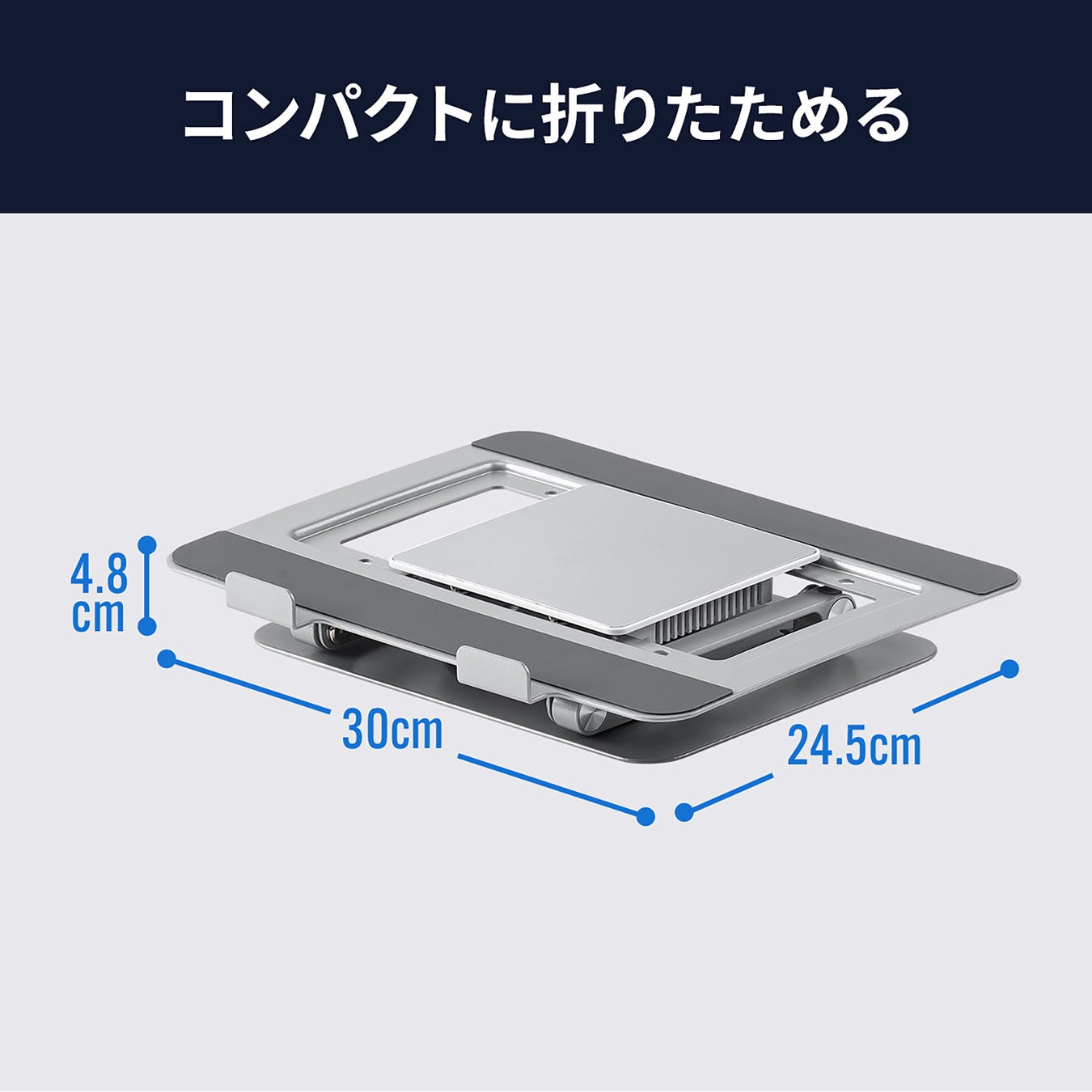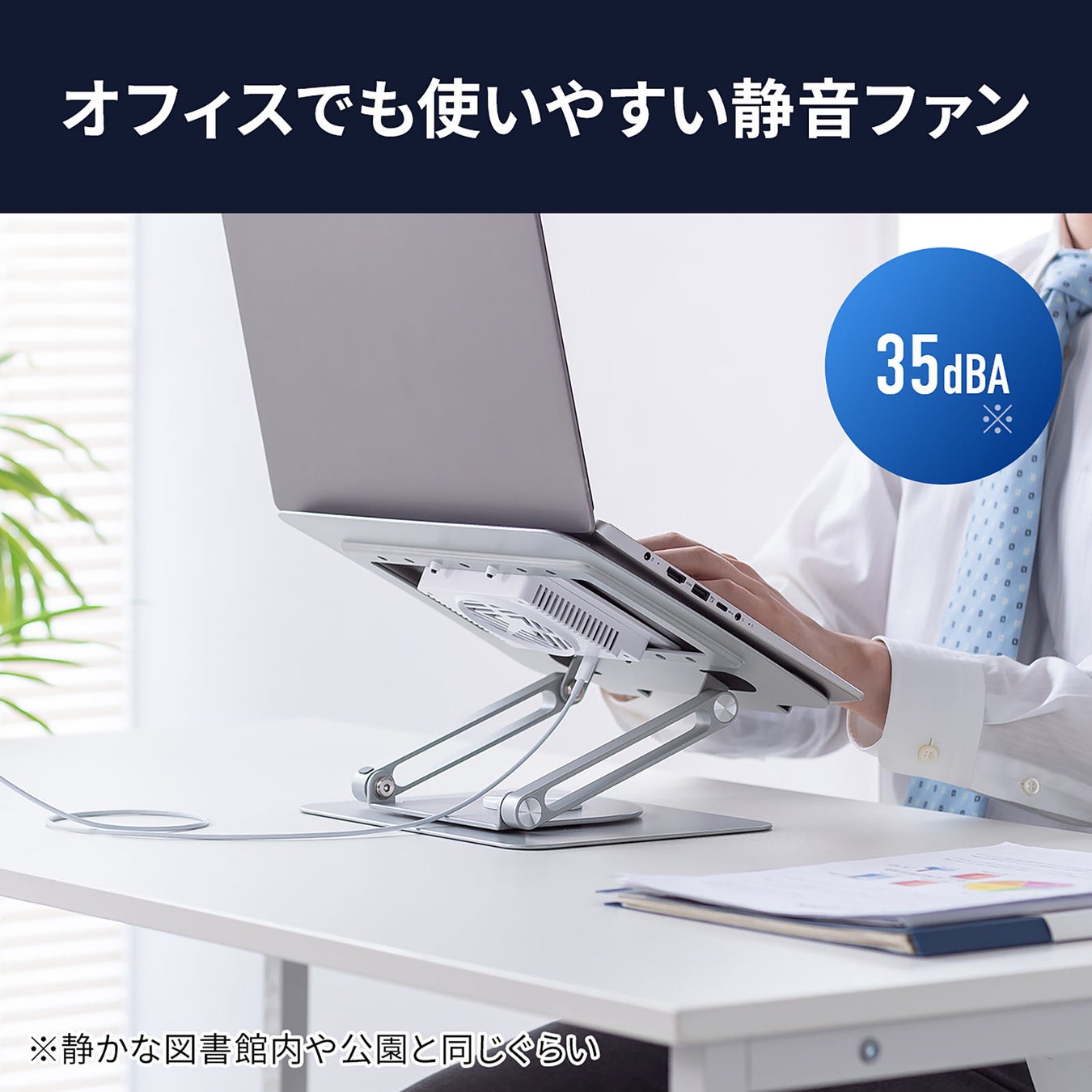 ファン稼働時でも静音性は35dBと静かで、オフィスや深夜の作業でも快適。使わないときはコンパクトに折りたためるのもポイントです。