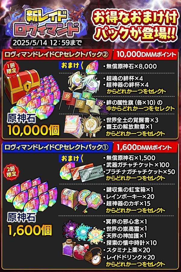 原神石に加えて、ガチャチケットや限界突破アイテムなど、お好きなアイテムを選択できる「ロヴィマンドレイドキャンペーンセレクトパック」が2種登場!