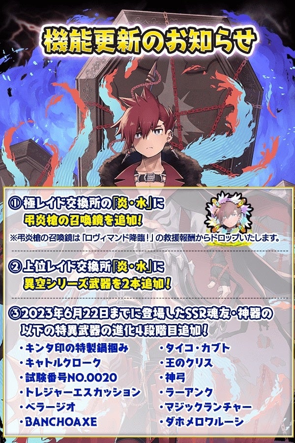 極レイド交換所の「炎・水」に「弔炎槍の召喚鏡」を追加!
