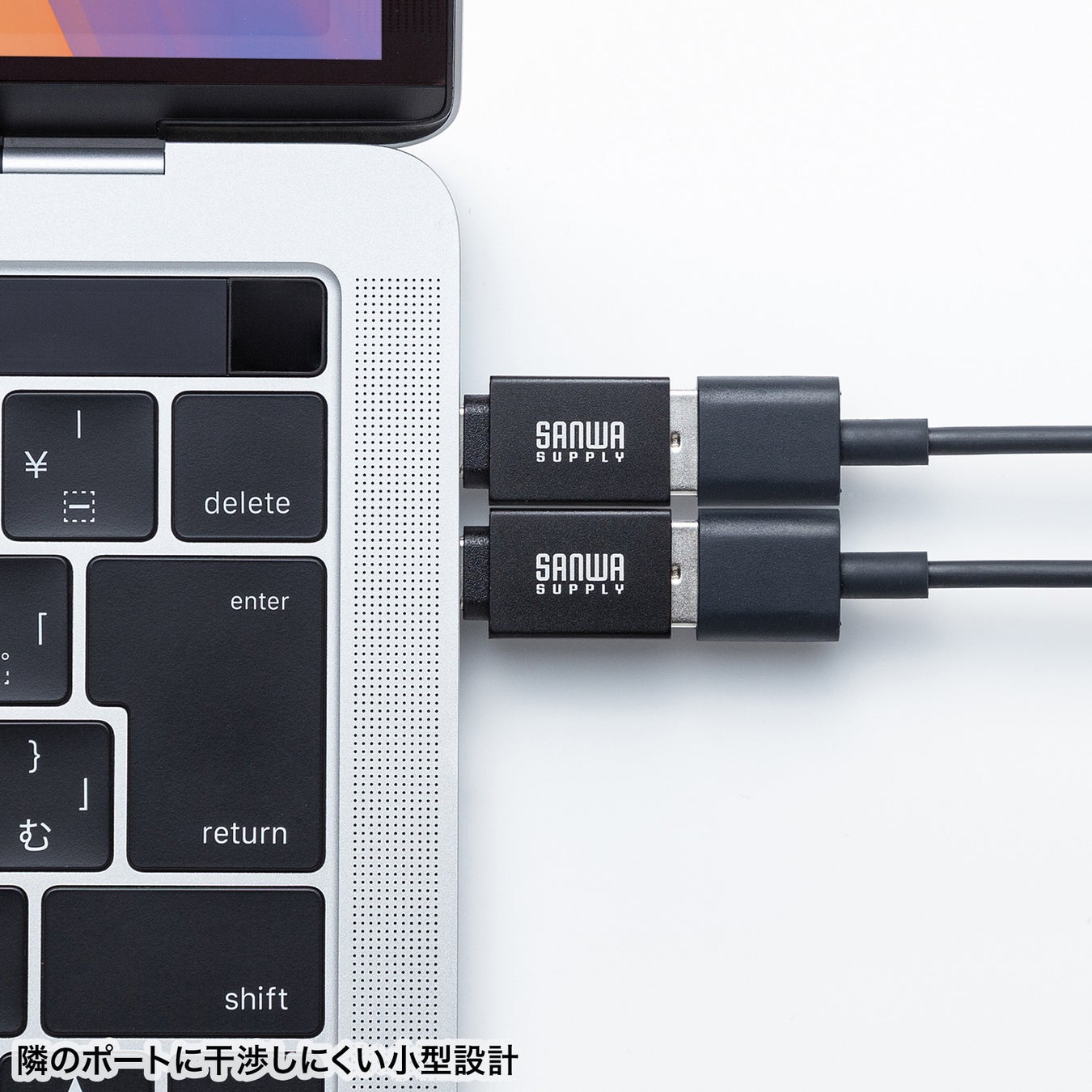 隣接ポートに干渉しにくい超小型設計で、MacBookなどの隣り合うType-Cポートにも挿すことができ、複数のデバイスを同時に接続する際も快適に使えます。