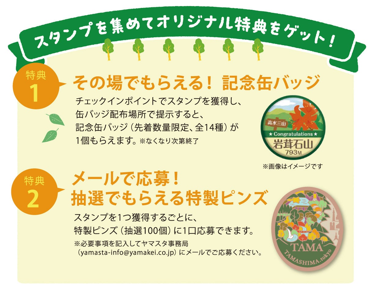 チェックインポイントでスタンプを1個獲得すると、獲得したスタンプと同じ絵柄の記念缶バッジがもらえます。さらに、抽選で当たる特製ピンズにご応募いただけます。特典の詳細は「東京多摩ハイク スタンプラリー」特設サイトをご確認ください。