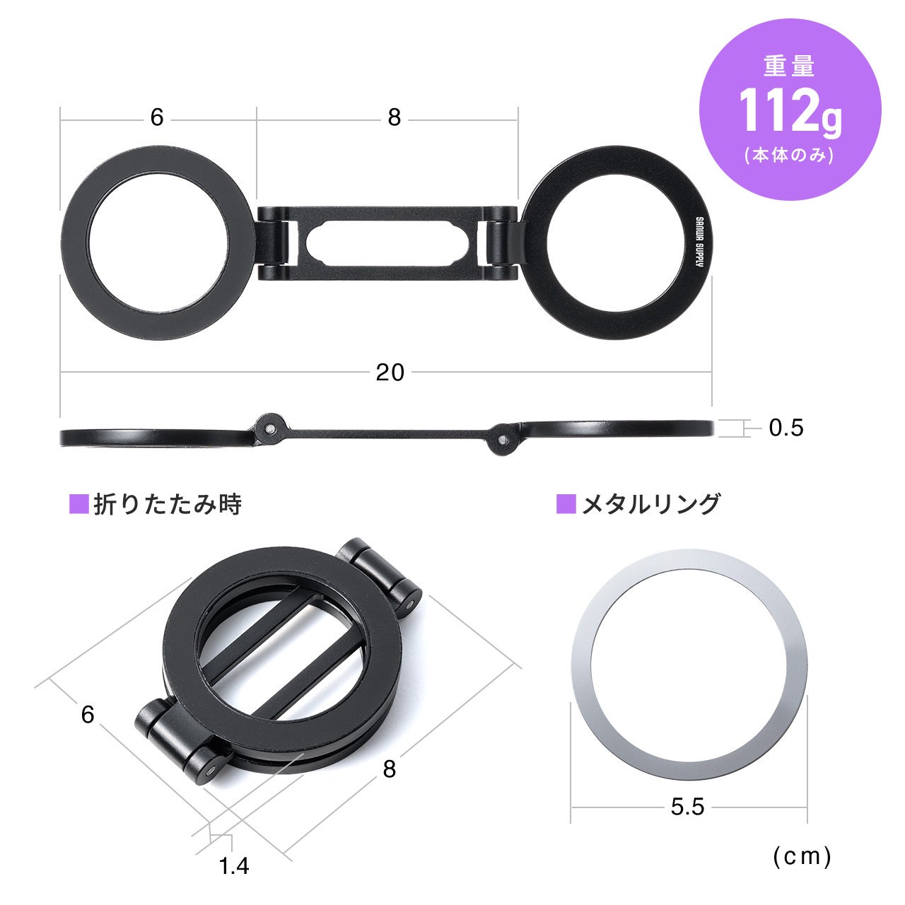 本製品のサイズはW6×D8×H1.4cm、 重量は112gです。