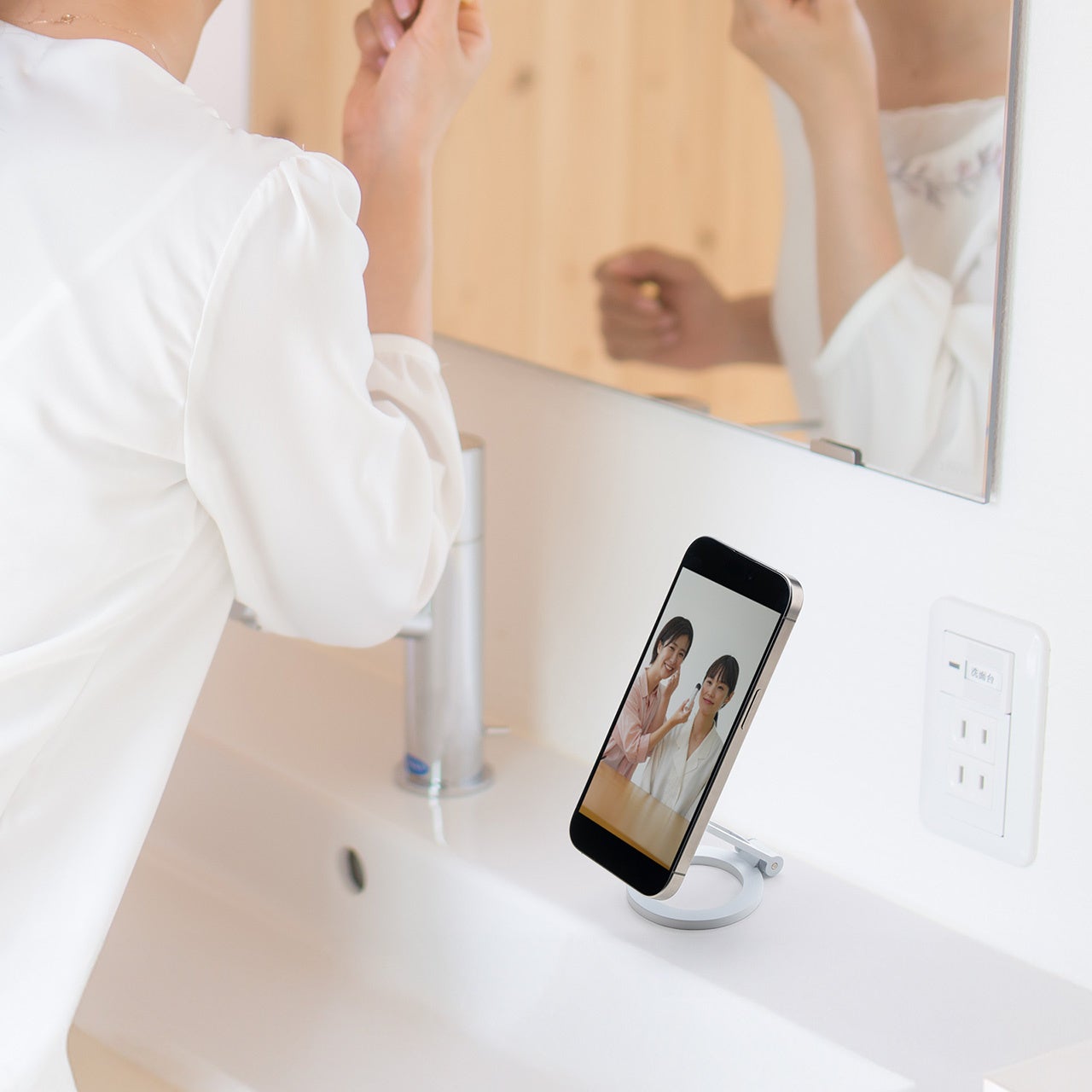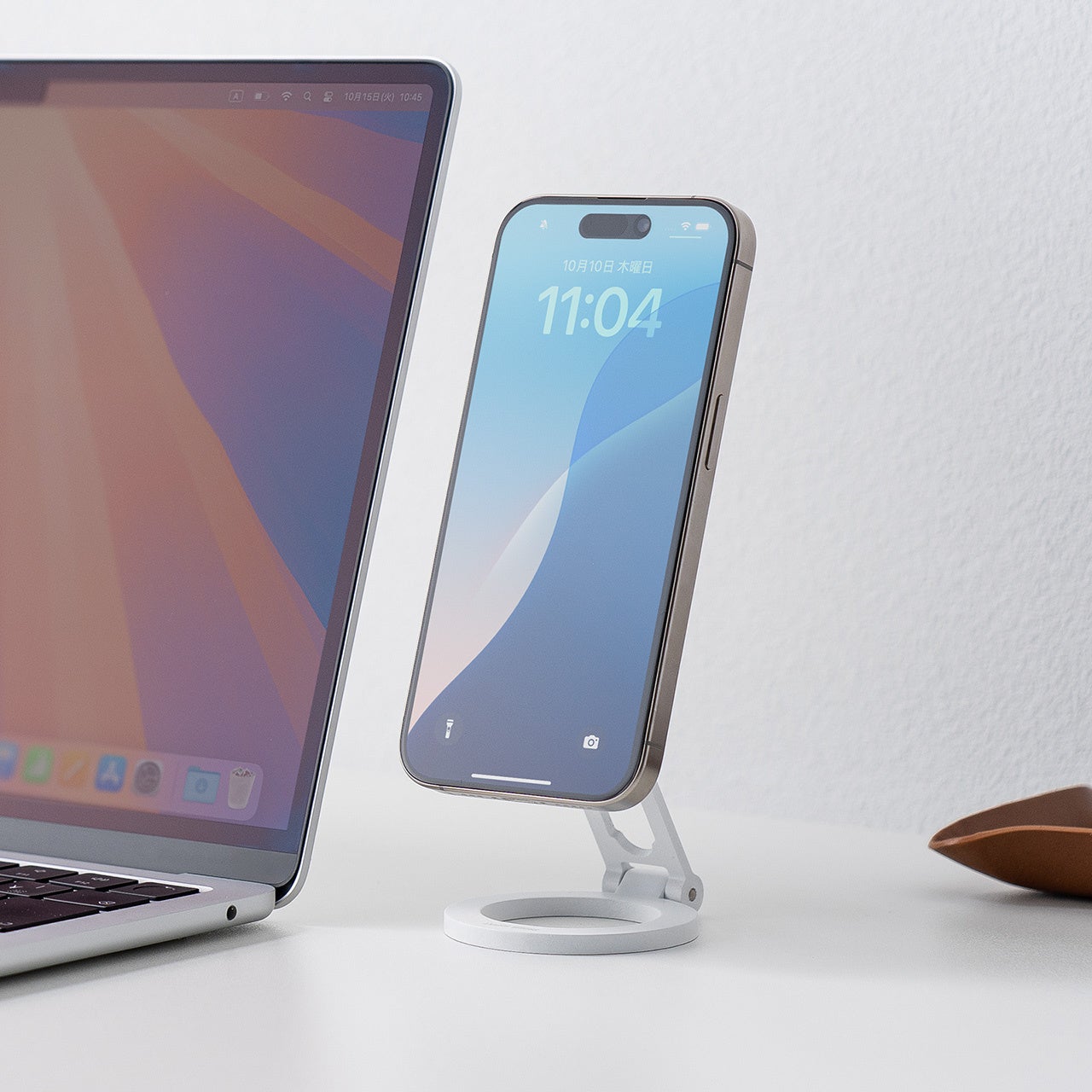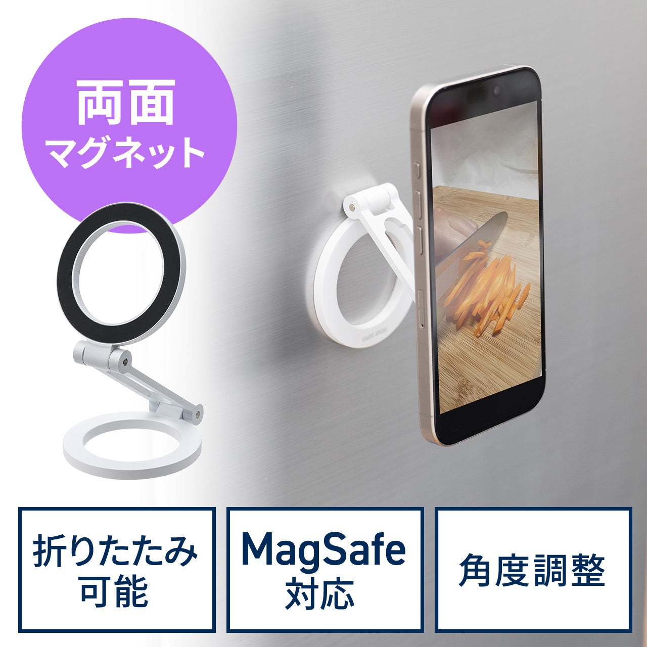 本製品は、MagSafe対応のiPhoneをマグネットで簡単に着脱できる両面マグネットスタンドです。