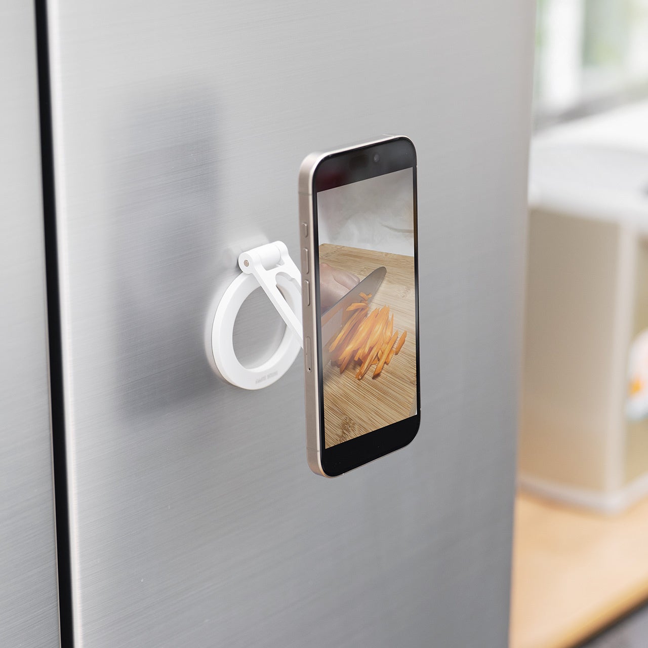 従来のスマホスタンドとは違い、固定部もマグネット吸着のため、冷蔵庫や金属フレームなど、磁力の働く場所であれば、さまざまな場所にピタッとくっつきます。
