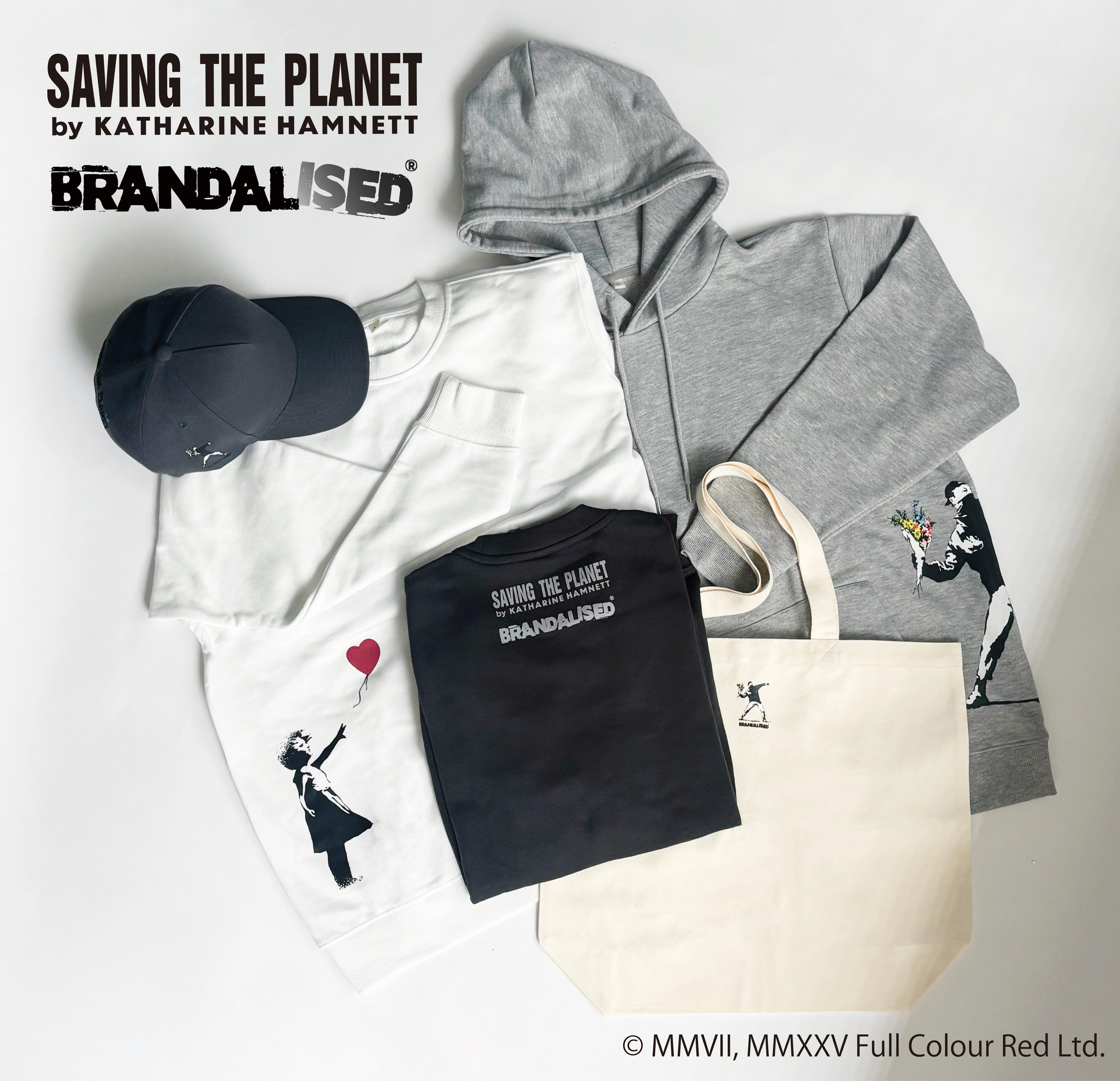 5分で描かれるグラフィティの世界とハイコンシューマー文化の間に位置するBRANDALISED®は、ジャンルの枠を超えた商品ラインを展開するストリートブランドです。「SAVING THE PLANET by KATHARINE HAMNETT」コレクションでは、覆面アーティストのグラフィティ写真を使用したデザインを施したデザインスウェットシリーズ、トートバッグ、キャップで男女問わず着用いただけます。