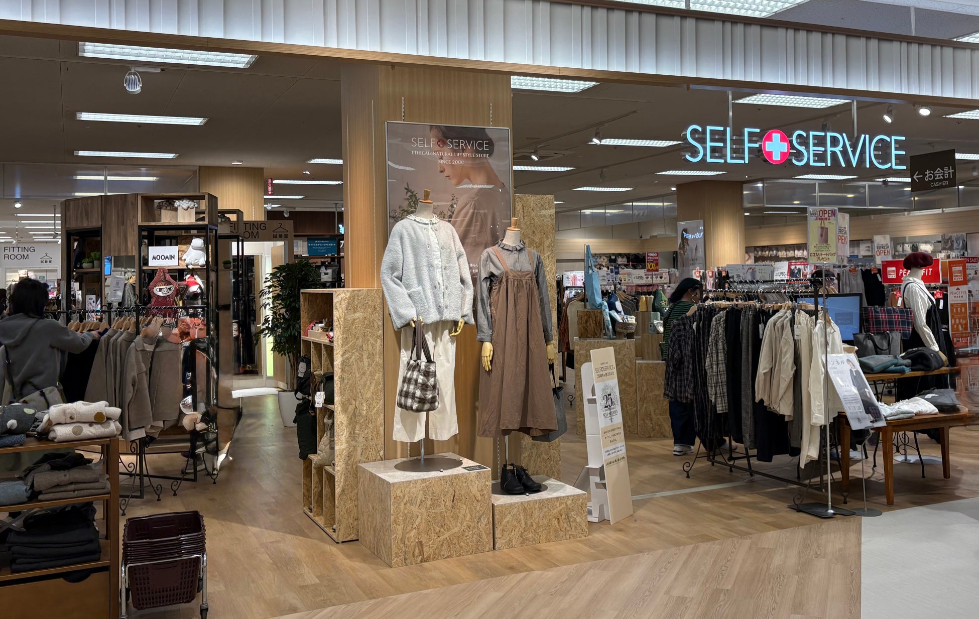 30~40代のファミリーターゲットのレディス・メンズのカジュアルウェアと、「トップバリュ ピースフイット」などのインナーウェアが揃います。環境に配慮したエシカル商品を展開する「SELF+SERVICE(セルフサービス)」を拡大するとともに、毎日にフィットする服「TVC(ティーヴィシー)」、トレンドを意識したフェミニンカジュアルの「ESSEME(エシーム)」や、ぽっちゃりサイズの「noannu(ノアンヌ)」「グレイテス」などを展開します。セルフサービスでは、最新の売場環境でお客さまに、サステナブル・エシカルな商品を提供いたします。