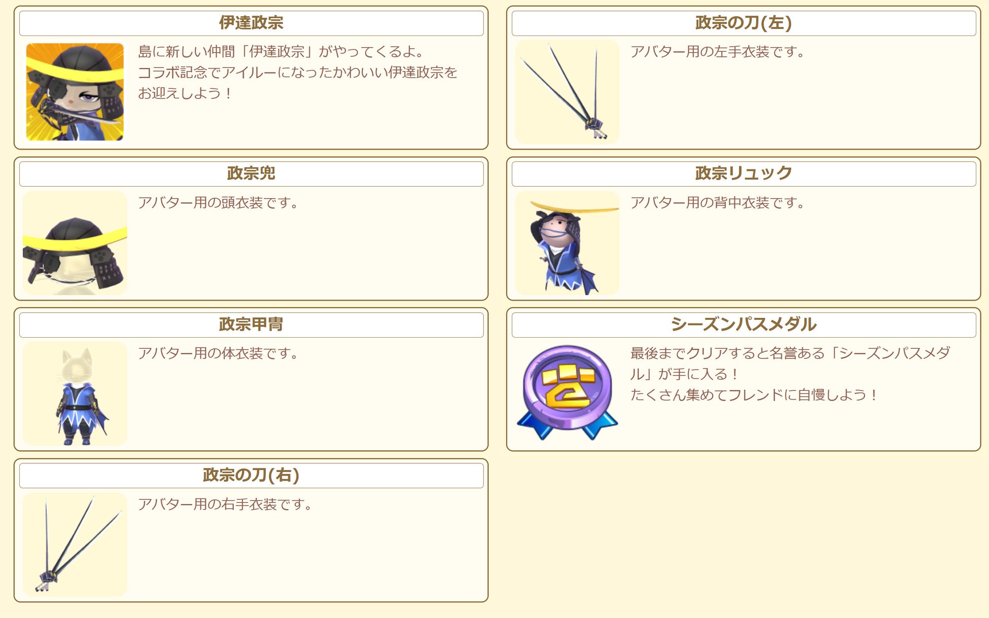 イベントに参加して新しい仲間「伊達政宗」を島にお迎えしたり、アバター用の衣装「政宗甲冑」などの豪華な報酬を獲得しよう!