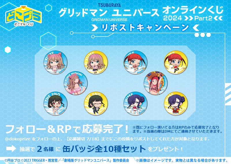「どこプラ」公式Xアカウントでは、「『グリッドマン ユニバース』オンラインくじ 2024 Part2」発売を記念して、抽選で2名様に缶バッジ全10種セットが当たる、プレゼントキャンペーンを実施中です。「どこプラ」公式Xのアカウントをフォローし、対象の投稿をリポストしていただくことでご応募いただけます。