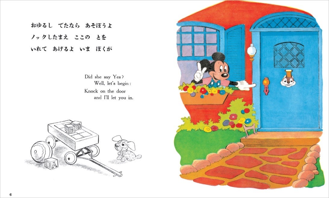 左のページがモノクロのイラスト、右のページがカラーイラストの構成。英語訳も付いています。ミッキーが家の中での過ごし方を紹介しながら、私たちに話しかけてくれる内容です。数々のオシャレなカラーリングの家具や雑貨が登場するのも魅力♪