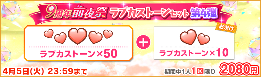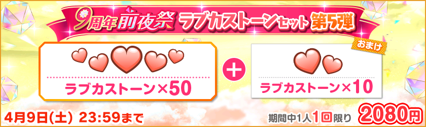 ・「9th Anniversary 1st Live 〜μ's〜」と「9th Anniversary 1st Live 〜Aqours〜」の「ライブスタンプ」は4/5 14:59まで獲得可能です。4/5 23:59のBOXくじの開催期間終了後は使用できなくなりますのでご注意ください。