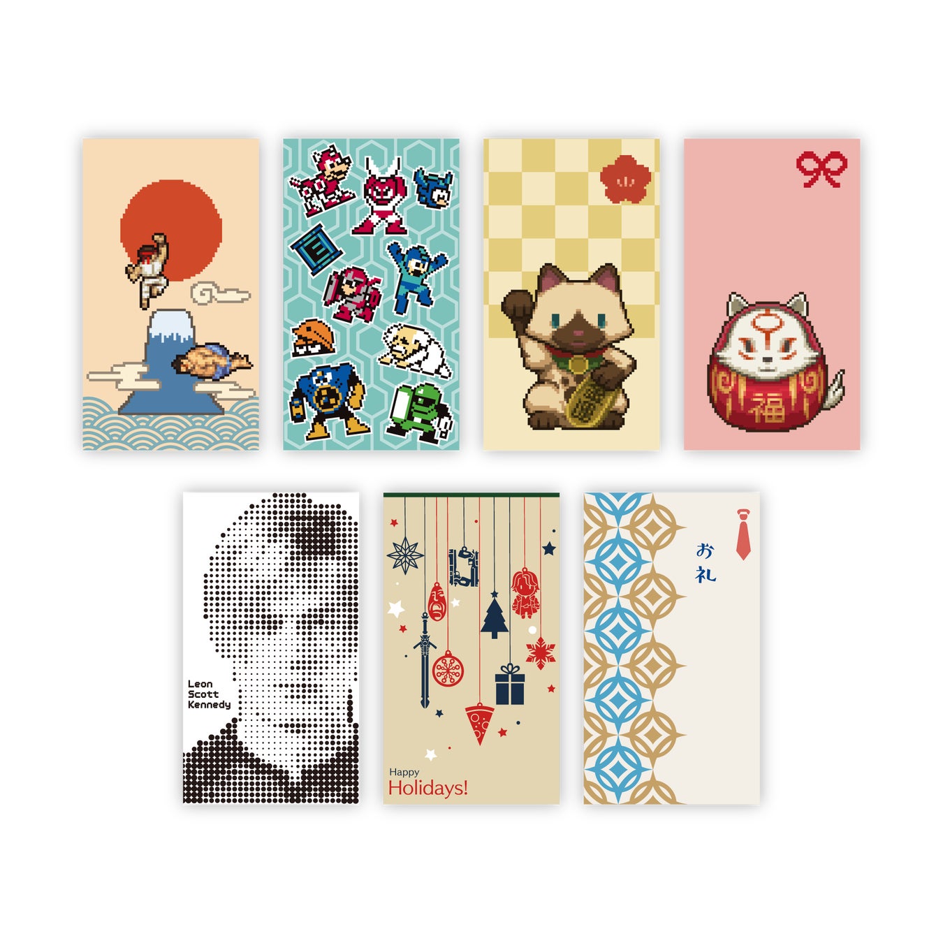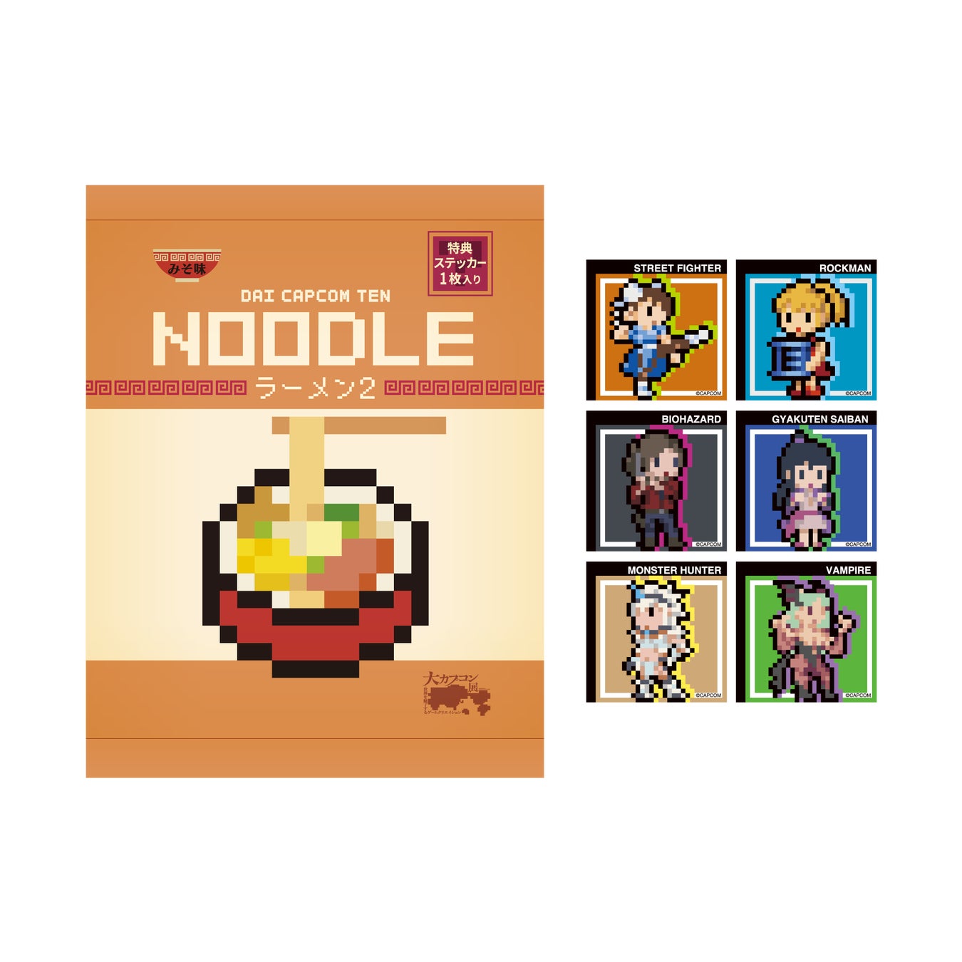 「モンスターハンター」、「バイオハザード」、「ストリートファイター」、「デビル メイ クライ」、「逆転裁判」、「ロックマン」、「大神」の7種類の絵柄がセットになった、