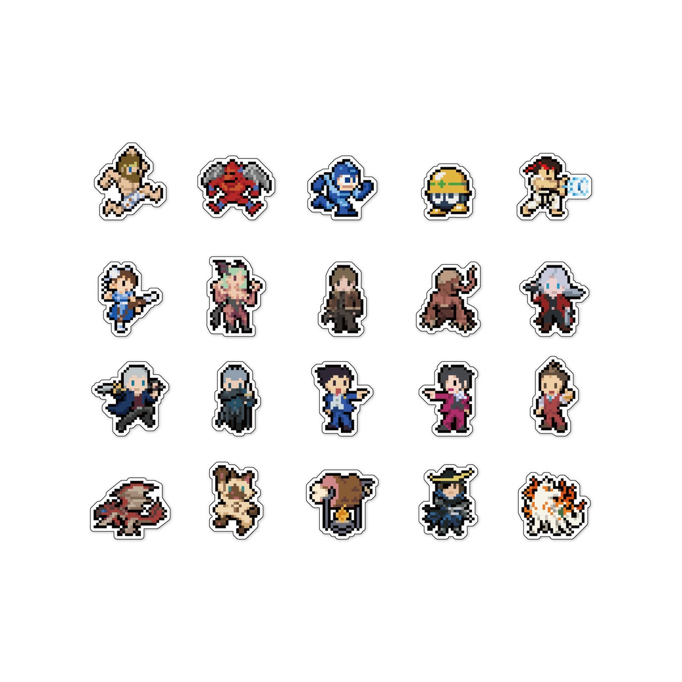 ドット絵のキャラクターたちのフレークシールセット。20種×2枚で40枚入り。