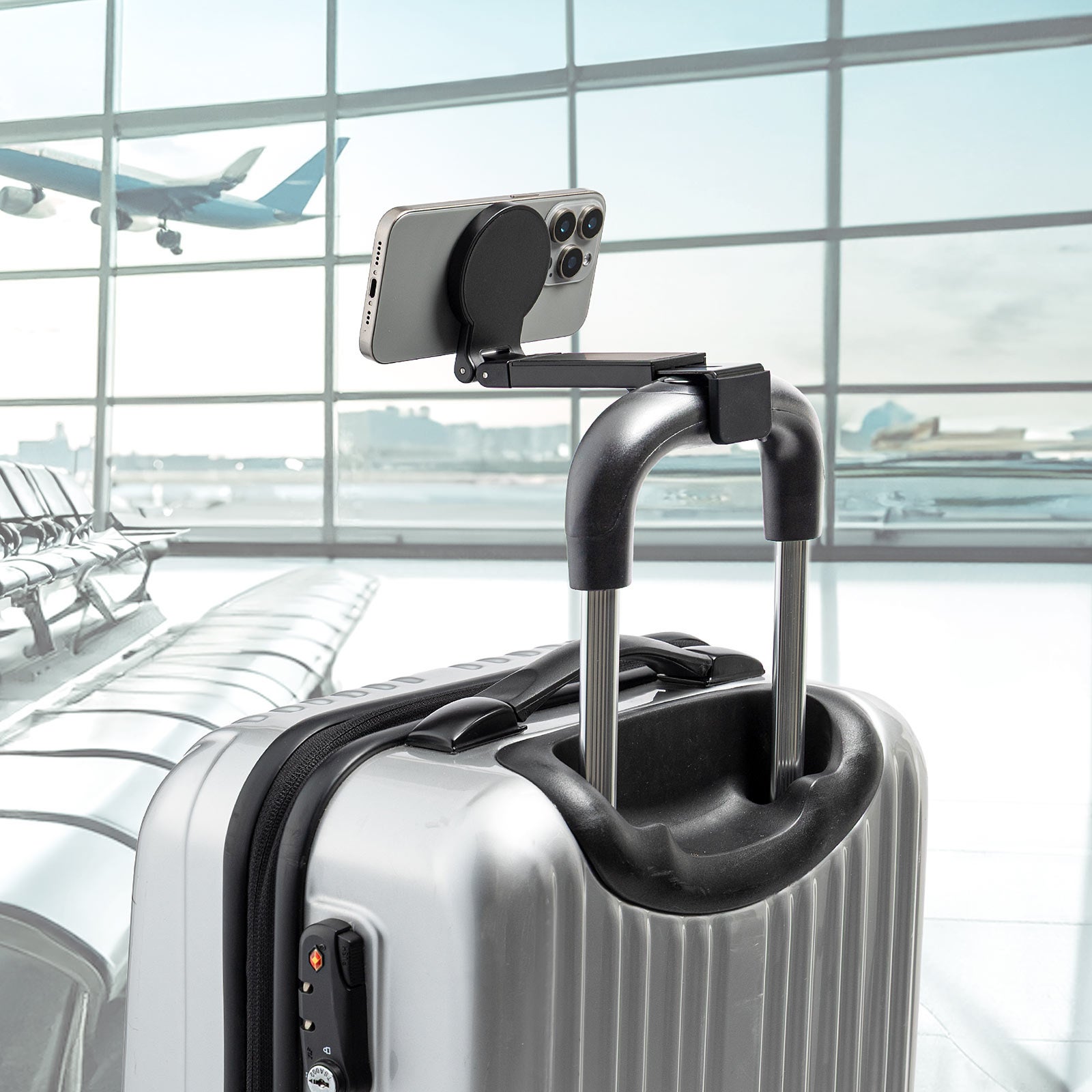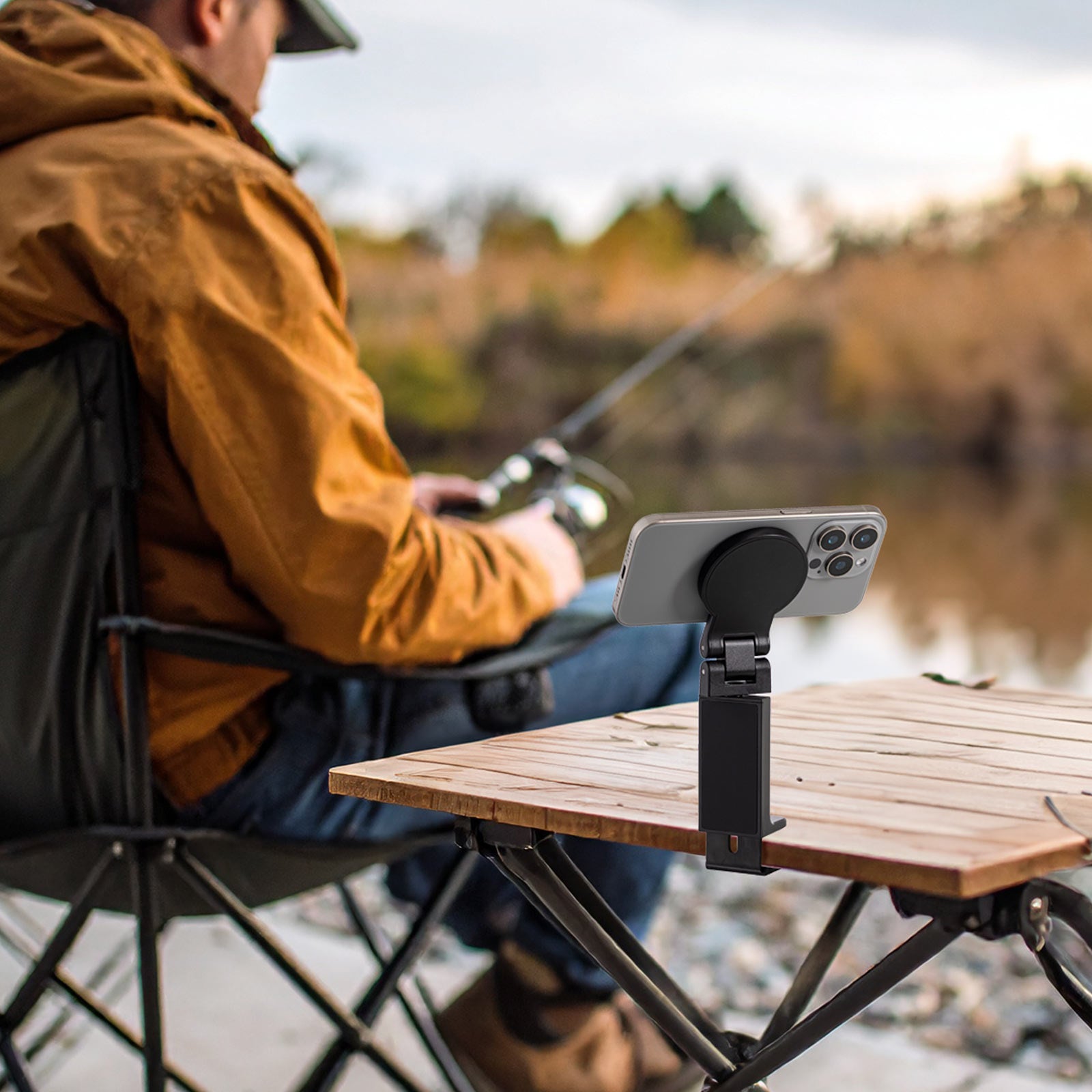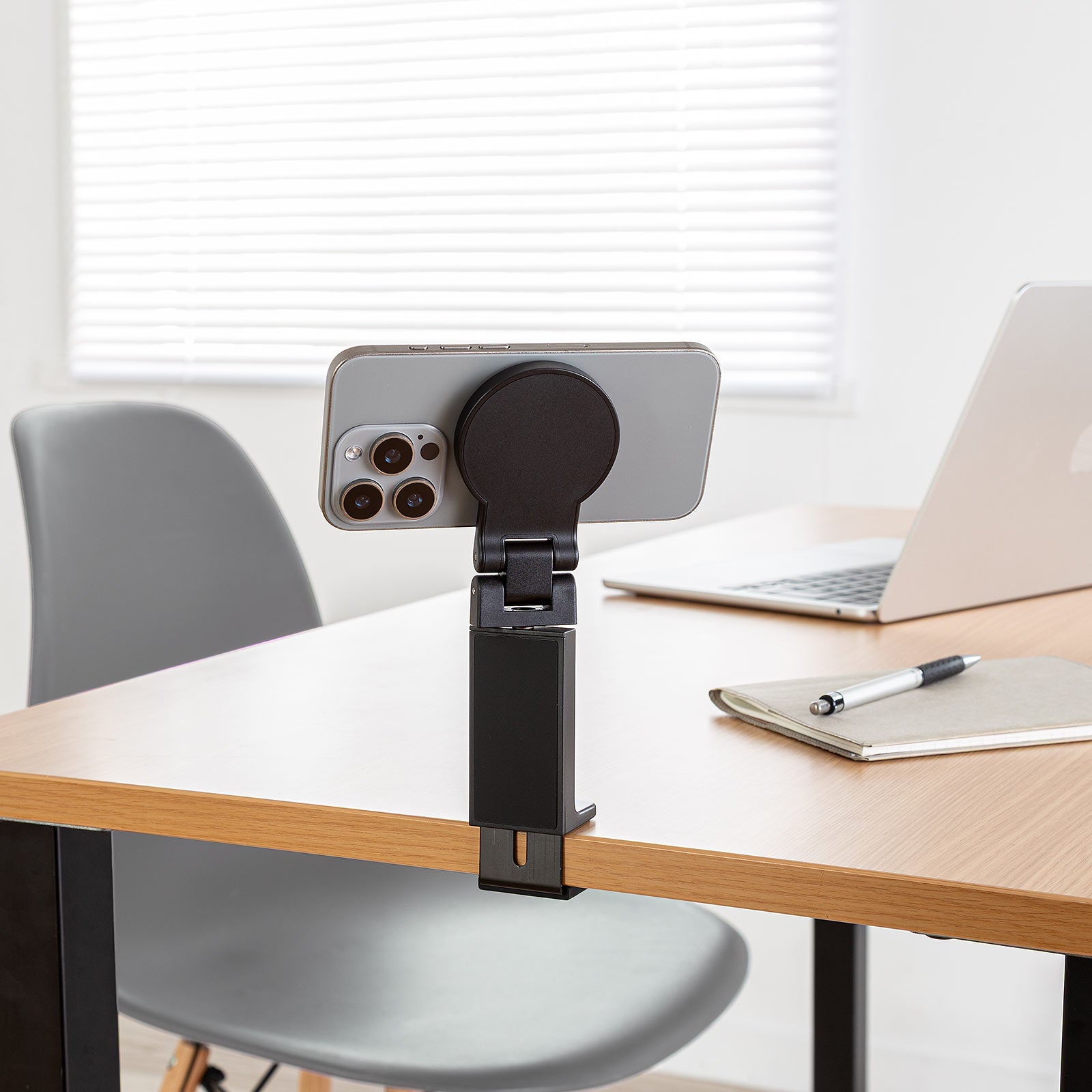 テーブルやキャリングケースの取っ手に挟んで固定ができ、MagSafe対応で簡単脱着ができるスマホスタンド