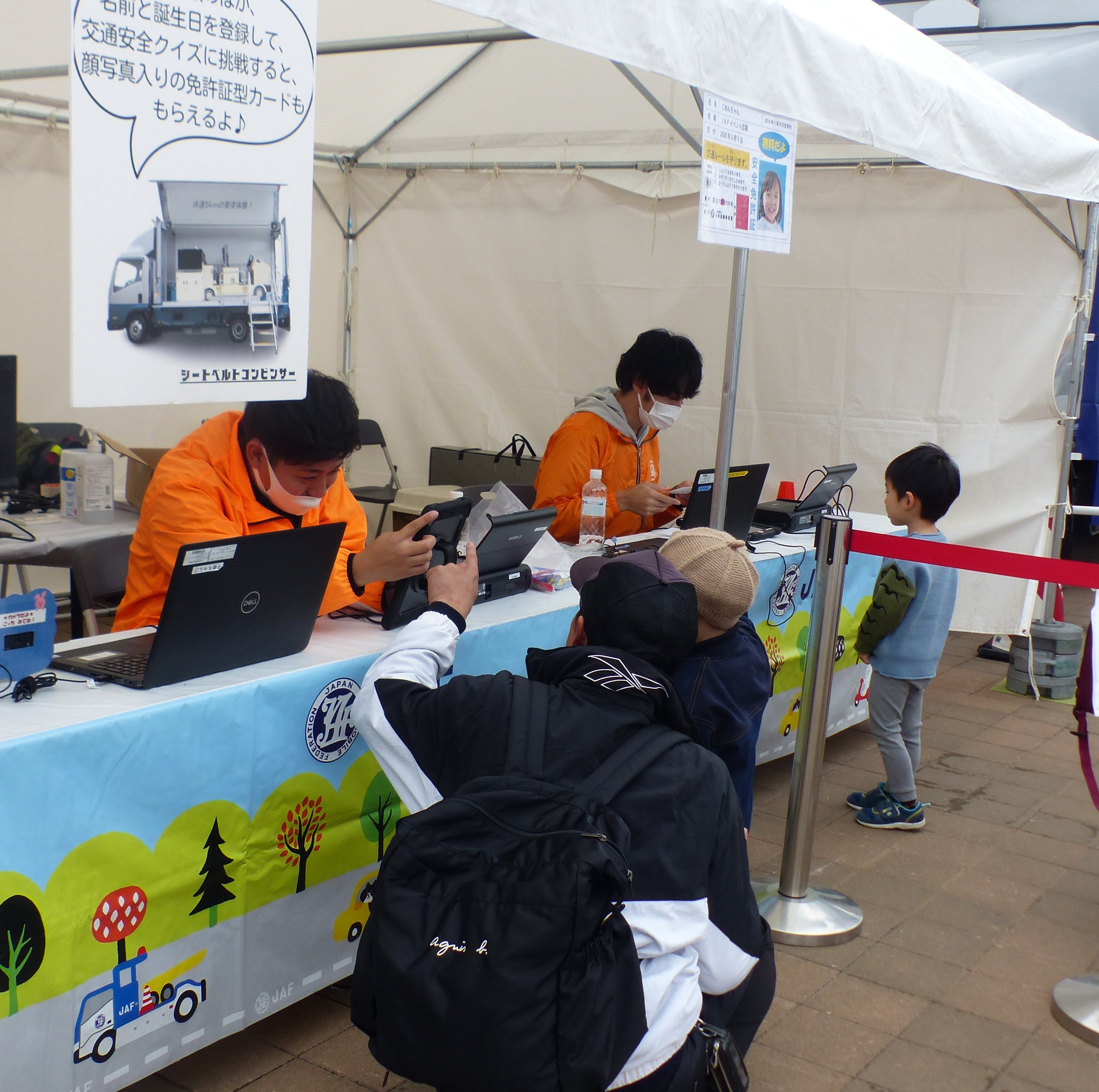 JAFブースでは、交通ルールをクイズで学び、その場で写真を撮って発行する「子ども安全免許証」で、小さなお子さまの交通安全に対する意識を高めます。また反応速度をゲーム感覚で測定し、俊敏性年齢が確認できる「俊敏性測定器」機材が体験できます。