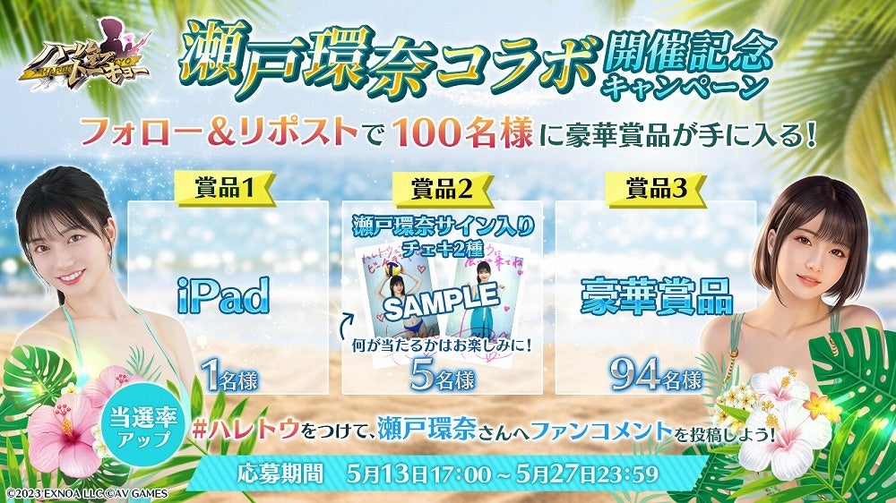 人気セクシー女優の瀬戸環奈さんとのコラボレーションを記念して、抽選で合計100名様にゲーム内に登場する衣装を着用したサイン入りチェキや、豪華賞品が当たるキャンペーンを実施いたします。
