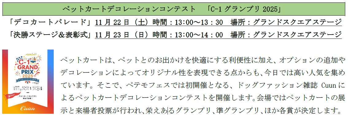 具体的には、2024年度に好評をいただいた、「わんわん大サーカス」や「飛行犬撮影会」を始めとする人気コンテンツに加え、今年は新たにペットカートのデコレーションを競う「C-1グランプリ2025」やドッグトレーナー・トリマーの職業体験といった参加型コンテンツが登場。また、保護猫の譲渡会や補助犬のお仕事デモンストレーション、千葉市動物介在教育など、命の尊さやペットの適正飼育について学びを深めるブースも充実しています。さらに、60社を超えるメーカーブースには、フードやおやつ、アパレル用品を始め、昨今の「お出かけ需要」で注目の高まる「AIRBUGGY」「TAVO」といった人気ペットカートも大集結。加えて、イベント会場にはピザやポテト、焼きそばを始めとしたフェスならではのキッチンカーの出店や飲食スペースも設けており、ペットとともにお買物や食事を楽しみながら1日をお過ごしいただけます。