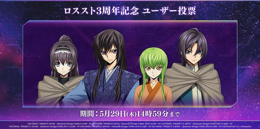 合同会社EXNOA(本社:東京都港区、CEO:村中 悠介、URL:https://games.dmm.com/)が運営するDMM GAMESと株式会社f4samurai(本社:東京都千代田区、CEO:金 哲碩、URL:https://www.f4samurai.jp/)が開発・運営するスマートフォン・PC向けゲーム『コードギアス 反逆のルルーシュ ロストストーリーズ』(以下、『ロススト』)がリリースから3周年を迎えました。これを記念して、さまざまなイベントとキャンペーンの開催をお知らせいたします。