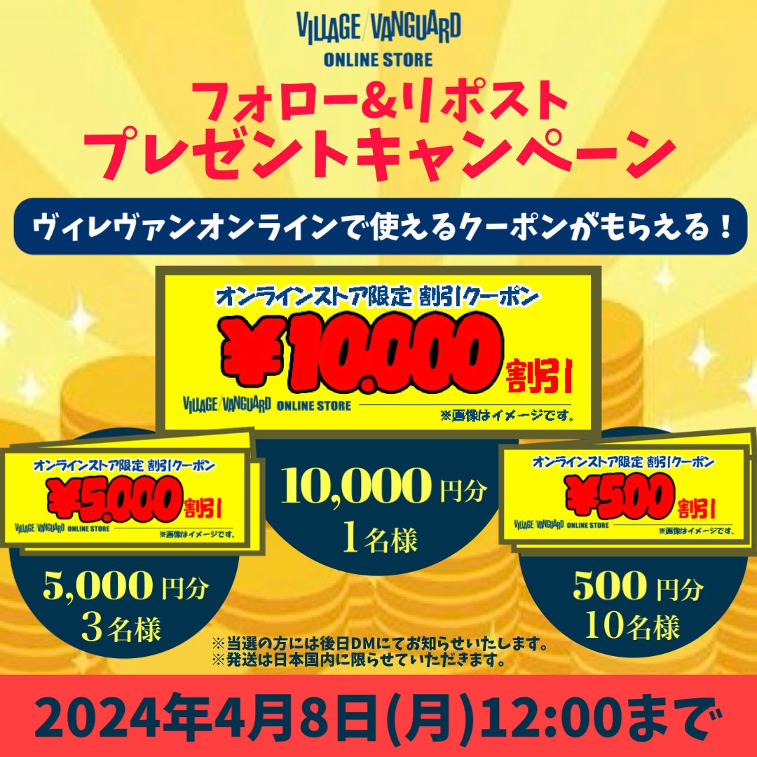 ヴィレッジヴァンガードオンラインストアで使用できるクーポンを最大1万円分プレゼントします!