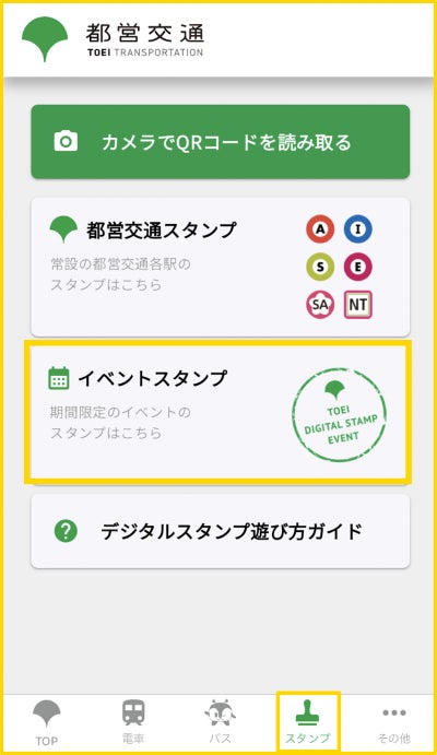 1 都営交通アプリを起動し、タブよりスタンプを選択。