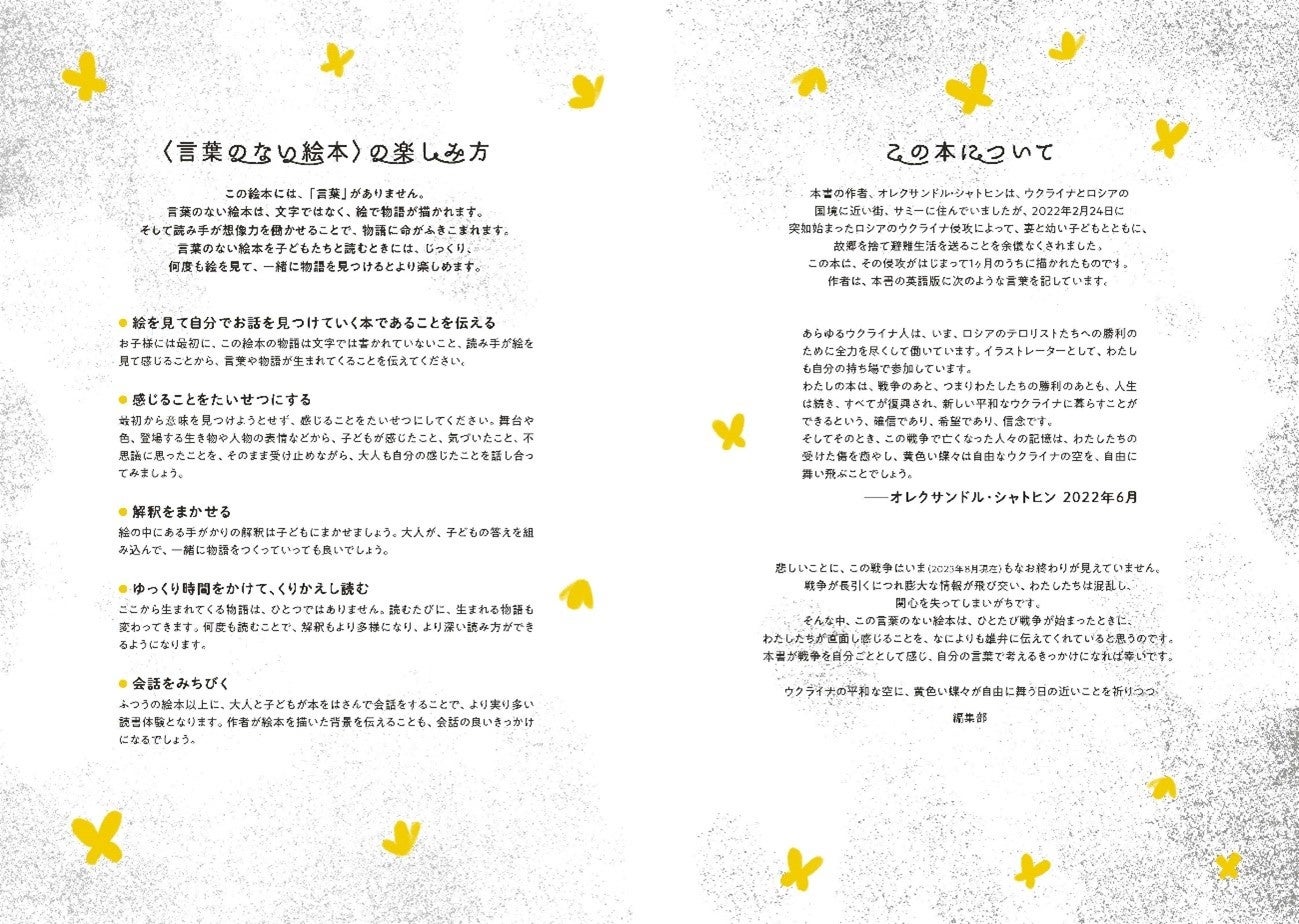 戦争によって、突如、妻と幼い子とともに故郷を追われた絵本作家のオレクサンドル・シャトヒンは、このあまりに理不尽で、胸を押しつぶすような現実を、まったく言葉を用いずに、ウクライナの国旗の色である青と黄色、さらには絶望と恐怖を表す黒、「命」の象徴である蝶によって描きだしました。そこには、絶望の果てにも希望を見いだそうとする人間の姿があります。