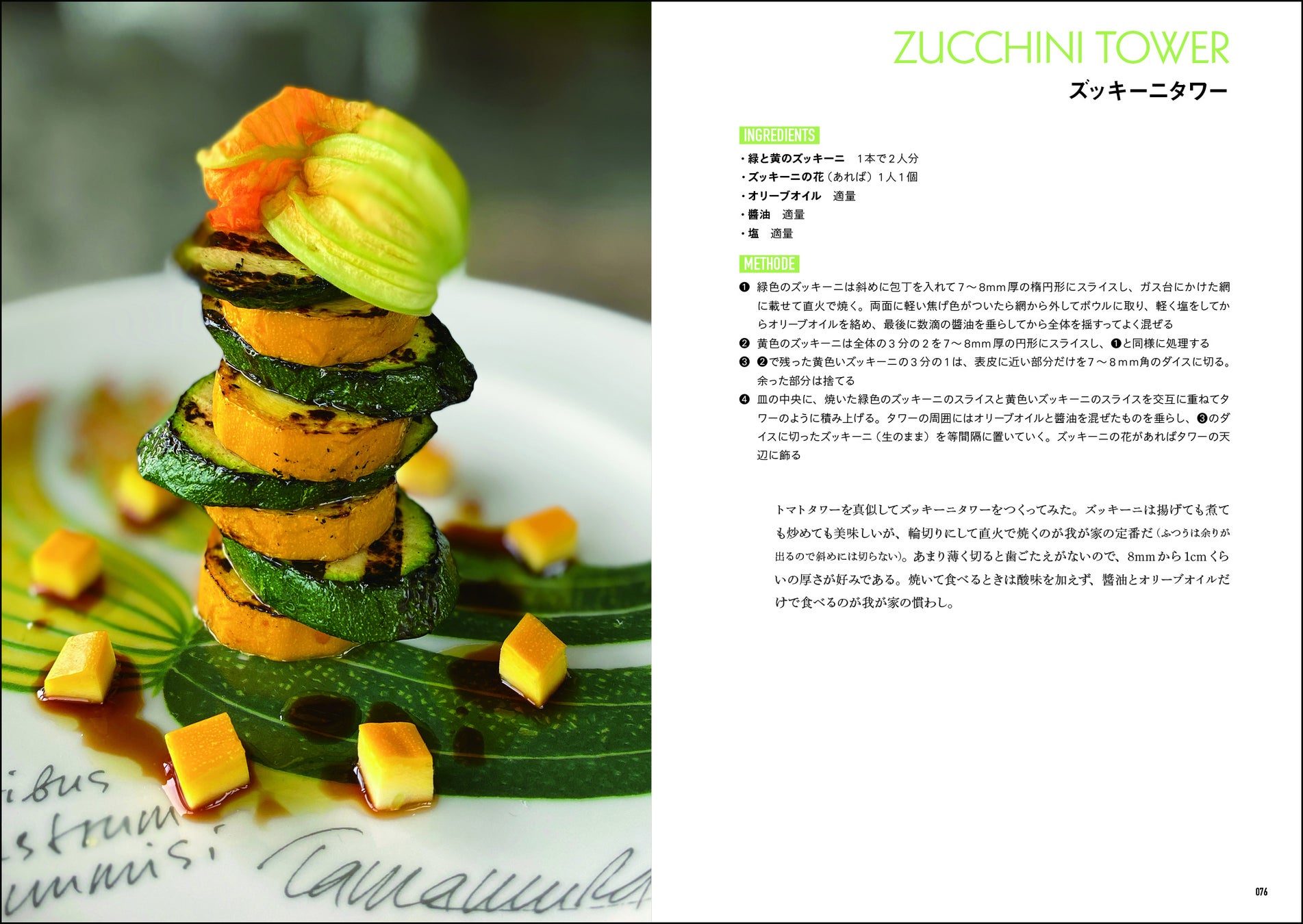 玉村氏は、自宅キッチンのすぐ前の庭に家庭菜園をつくりました。トマトをはじめ、スッキーニやピーマン、キュウリにインゲン豆など、家庭菜園で収穫した野菜を使ってできた前菜を紹介します。