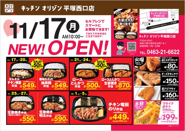 弁当・惣菜専門店「キッチンオリジン」「オリジン弁当」を展開しているイオングループのオリジン東秀株式会社(本社:東京都調布市/代表:後藤 雅之)は、11月17日(月)10時に、キッチンオリジン平塚西口店をオープンいたします。