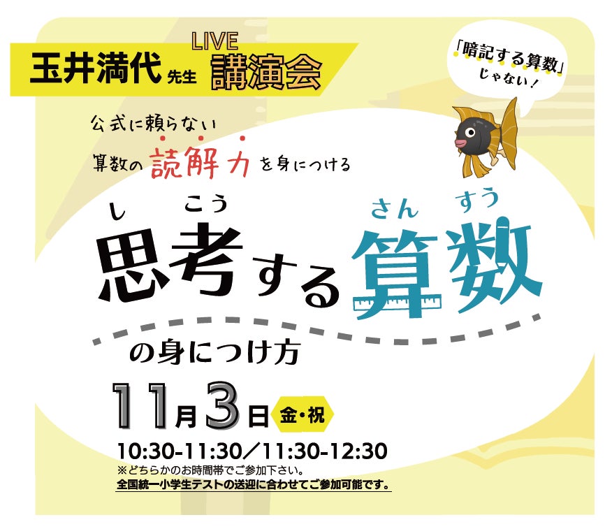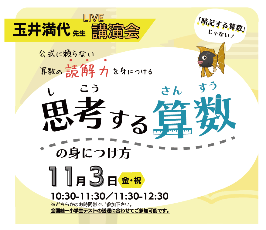 「玉井式」の生みの親、玉井満代先生に語りつくしていただくオンラインライブ講演会! 思考する算数とは何か、現代のこどもに必要な教育とは何か?そんなテーマに挑む60分。