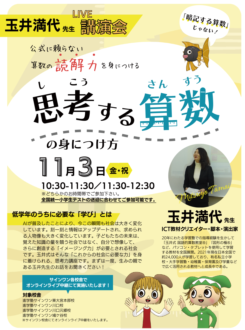 【埼玉県の進学塾サインワン】11月3日(金・祝)玉井満代先生のオンライン講演会「思考する算数の身につけ方」を実施します!