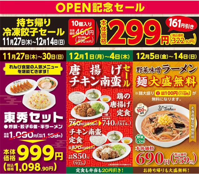 当店では、11月27日(木)から期間限定で、人気メニューがおトクに楽しめるオープン記念セールを実施します。
