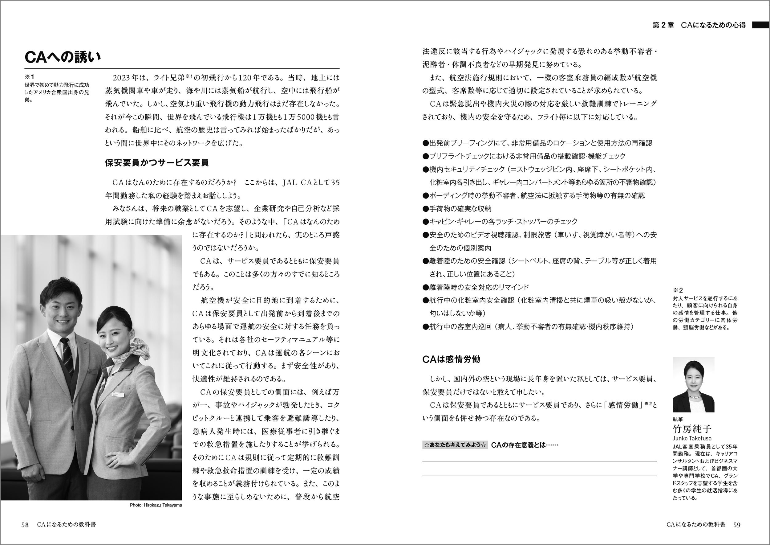 CAに相応しいマインドについては、JAL客室乗務員として35年間の勤務経験をもつ竹房純子氏が、自身の経験をまじえ執筆。