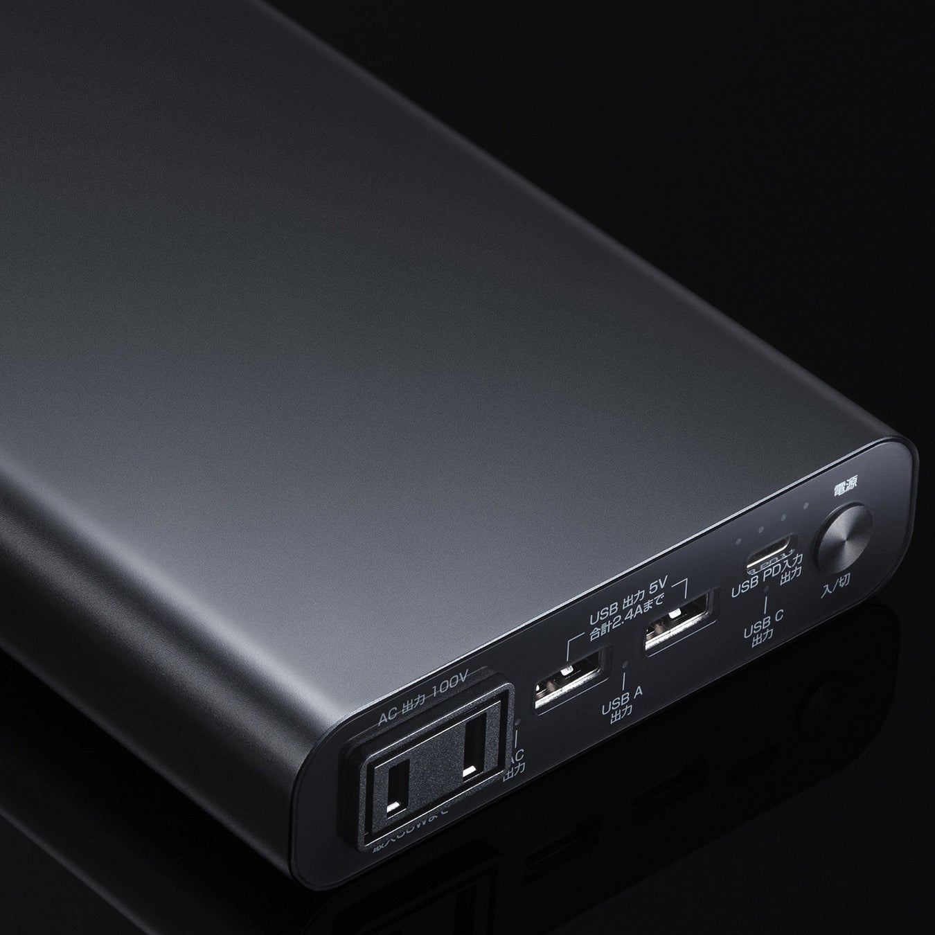 AC出力、USB PD対応Type-C、USB Aと多彩な出力ポートを備えながらも、薄型・コンパクトな設計を実現した高性能モバイルバッテリーです。