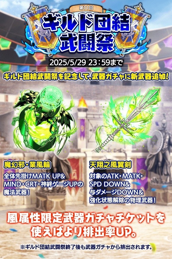 また、武器ガチャに「魔幻邪・業風輪」「天翔之風翼剣」の2種が追加!イベント報酬の風属性限定武器ガチャチケットでも入手可能ですので、ぜひイベントに挑戦してみてください。